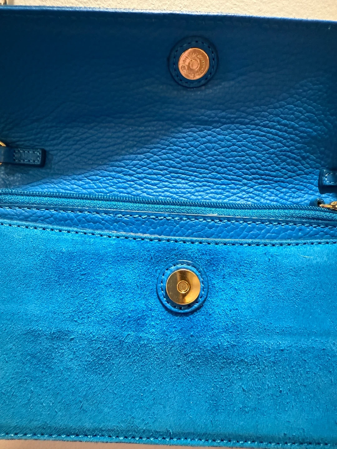 334This is a Banana Republic Italian leather and suede clutch in a vibrant blue. It features a chain strap and a magnetic closure. The interior has a zippered pocket and compartments for organization. It's a stylish and functional accessory!