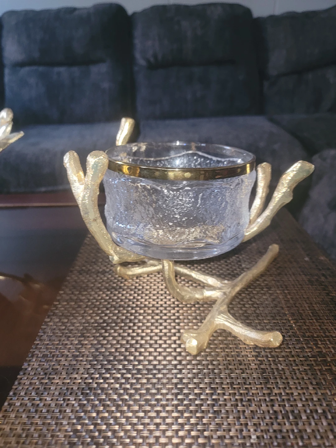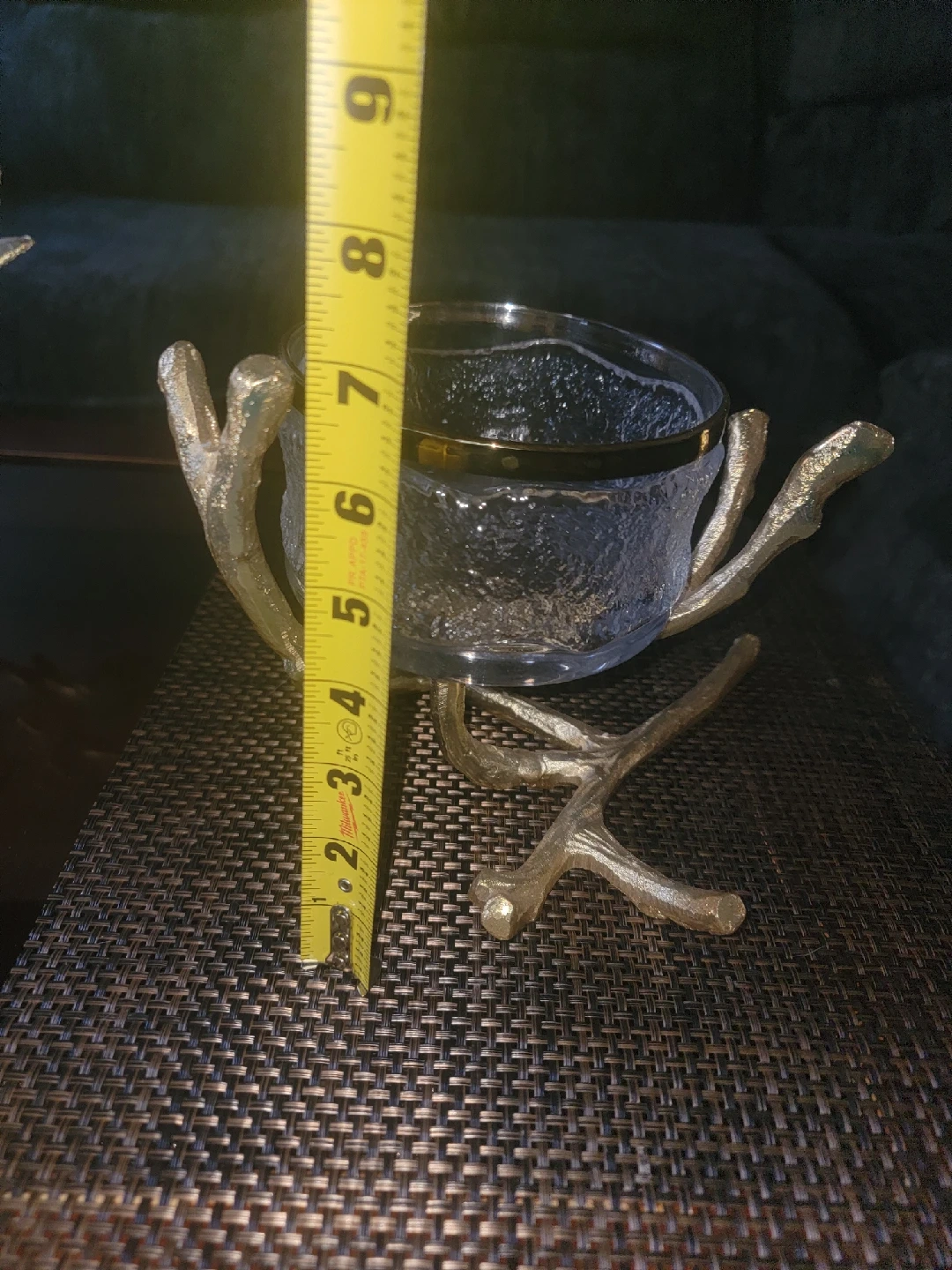 This is a beautiful glass candle holder with a gold branch design. It's in great condition and perfect for adding a touch of elegance to any room. It measures approximately 4 inches in diameter and 6 inches in height