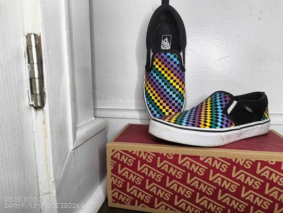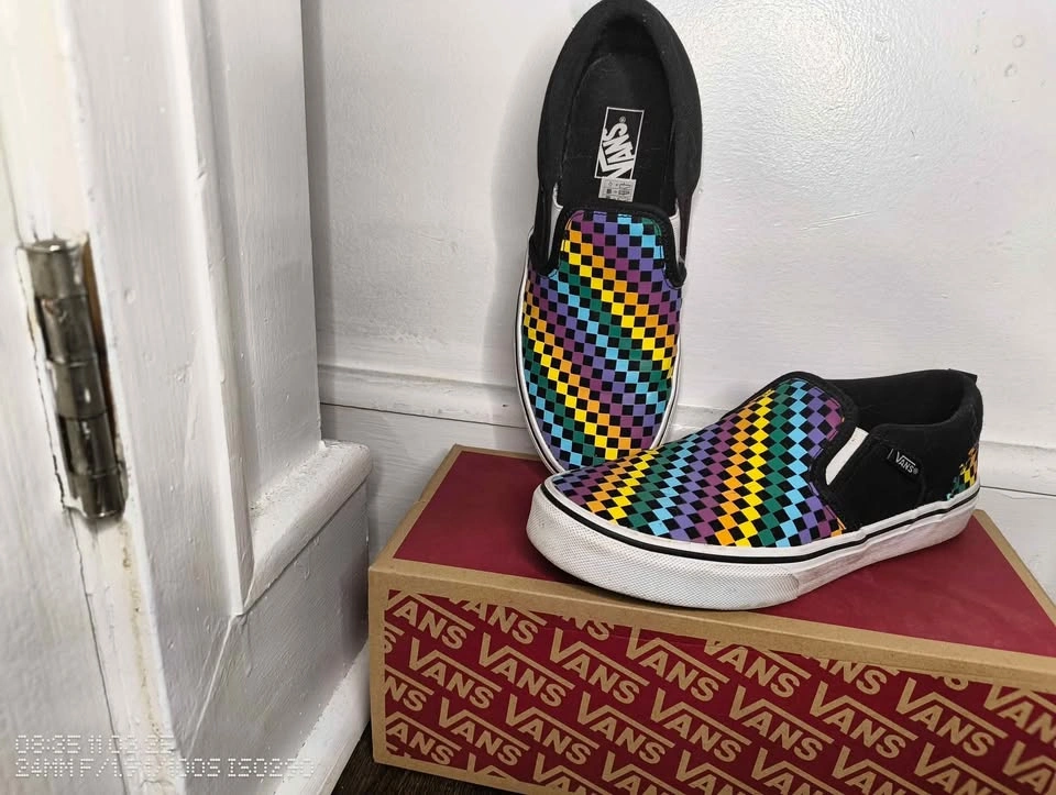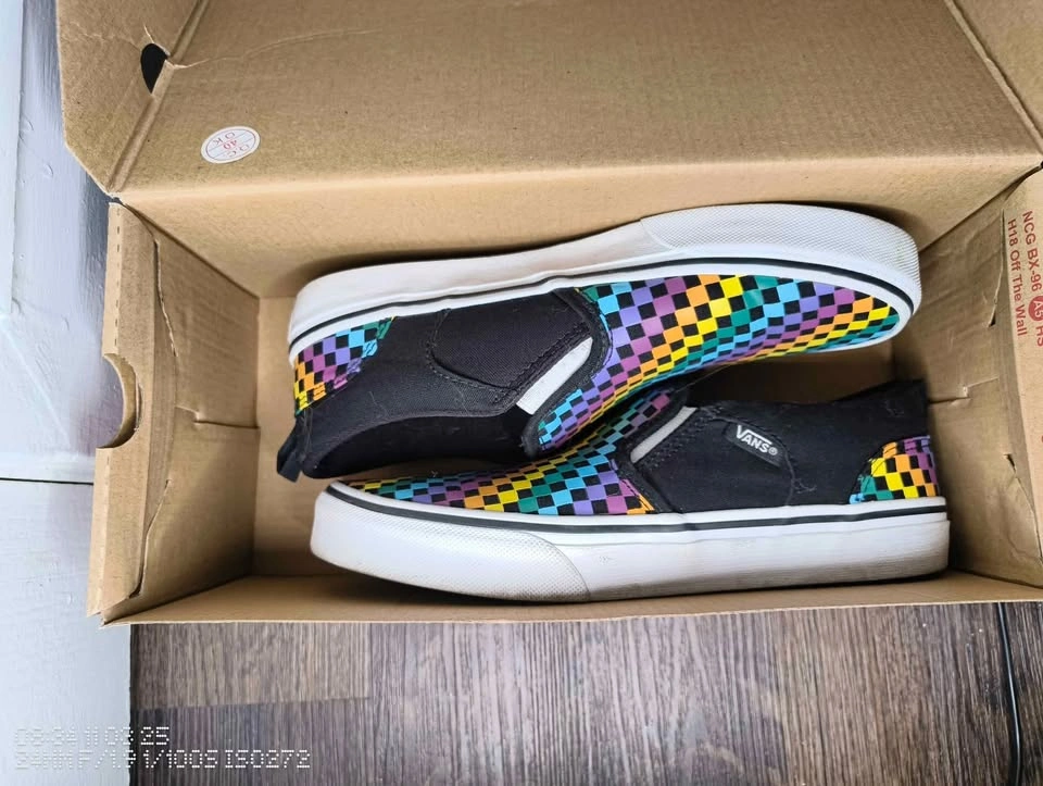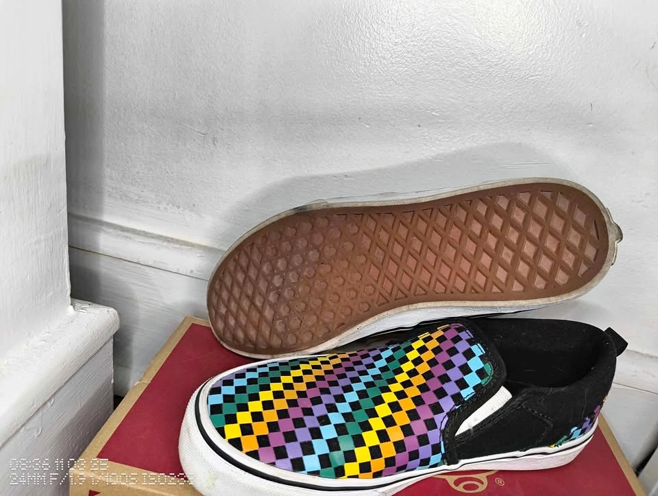Bright, bold, and super comfortable Vans slip-ons with the classic waffle sole and a colorful checkerboard pattern. No major scuffs or wear — soles and insides are in great shape.