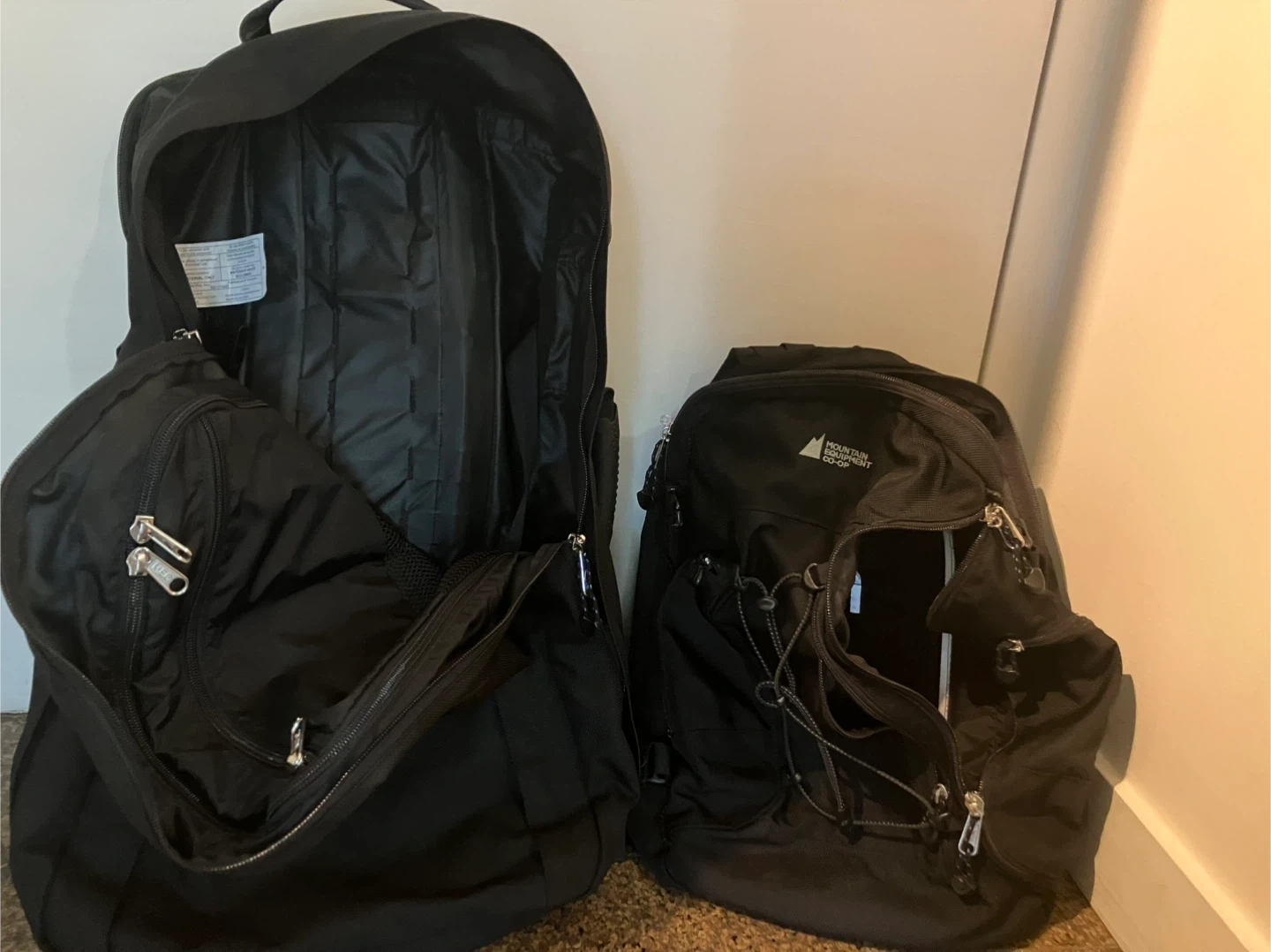 Selling two Mountain Equipment Co-op backpacks. One is larger and the other is smaller. Both are black and in perfect condition. Perfect for school, travel, or everyday use! Excellent quality never used! Selling both together for $60! An incredible offer!