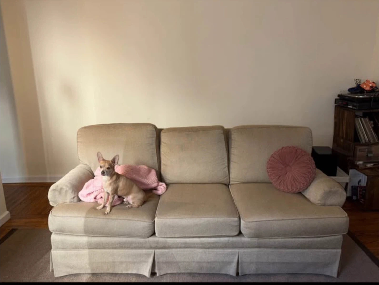 Selling a comfy beige sofa. Good condition but we are ready for something larger. Perfect for living room. Used in home with dog ~4 yrs. $150 OBO. Handful of small marks / minor stains. Cushions still firm, covers unzip / can be taken off to wash. Think it would look super nice with a new cover. Pick up only!