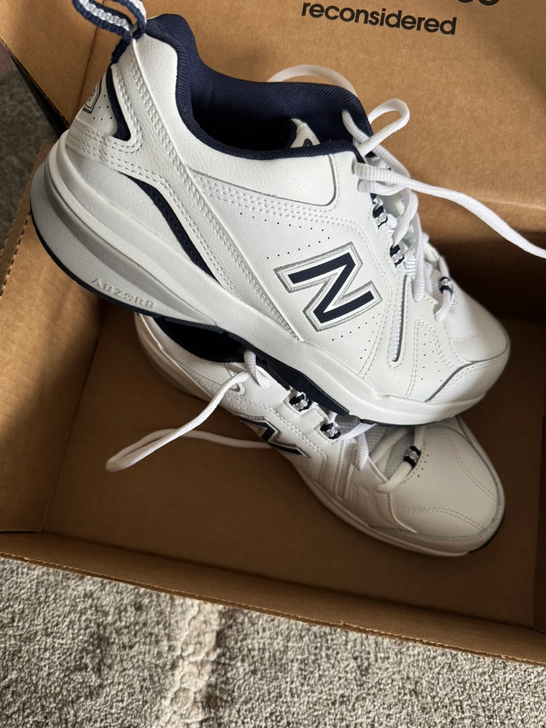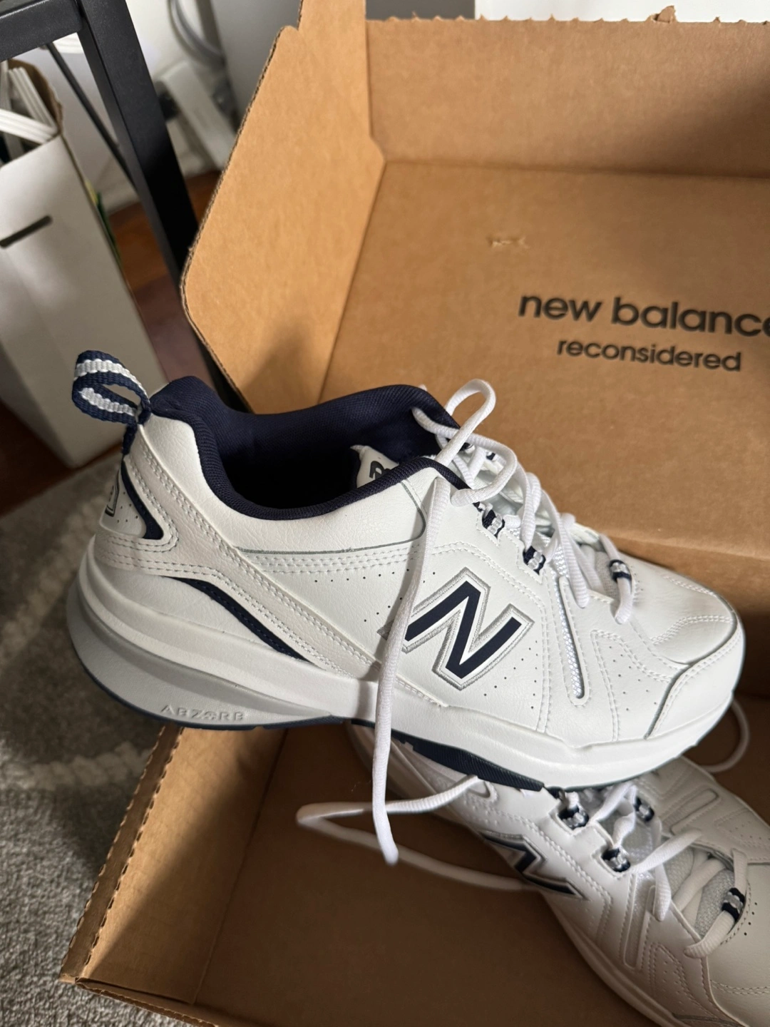 I'm selling a pair of New Balance 608 training shoes in white. They are brand new and come with the original box!