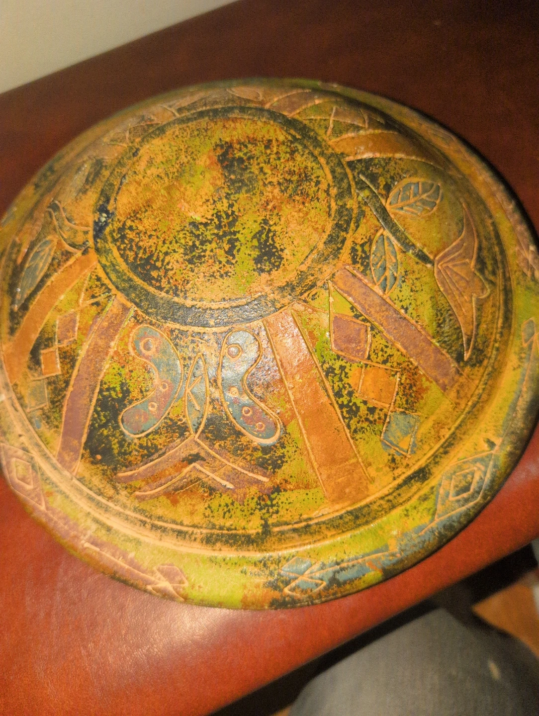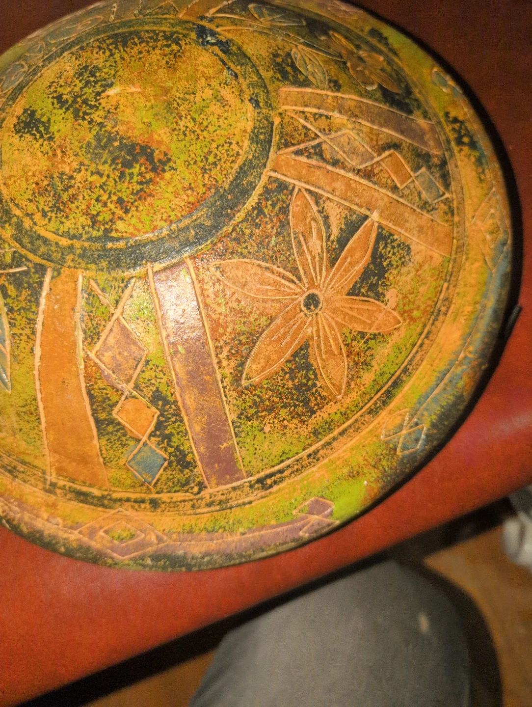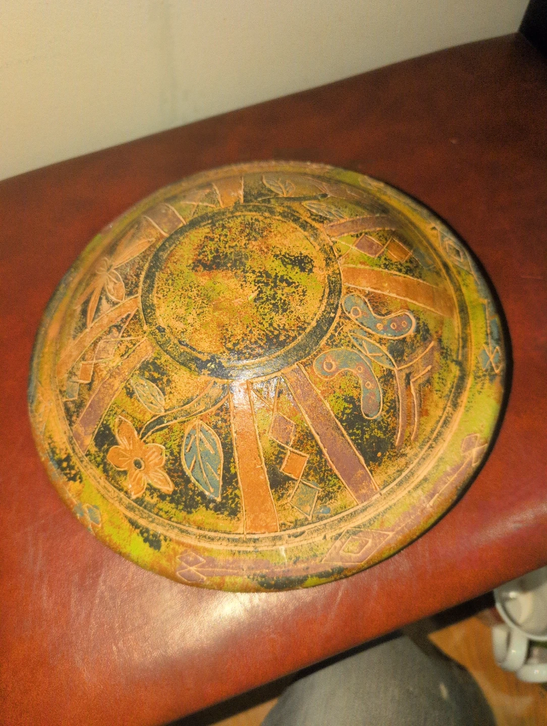 Selling a decorative bowl featuring a unique floral design. It adds a touch of artistry to any space. The bowl has a beautiful blend of colours and patterns, making it a standout piece for your home decor. This is a ceramic dish which, judging by its style, may be a pre-Columbian artifact.