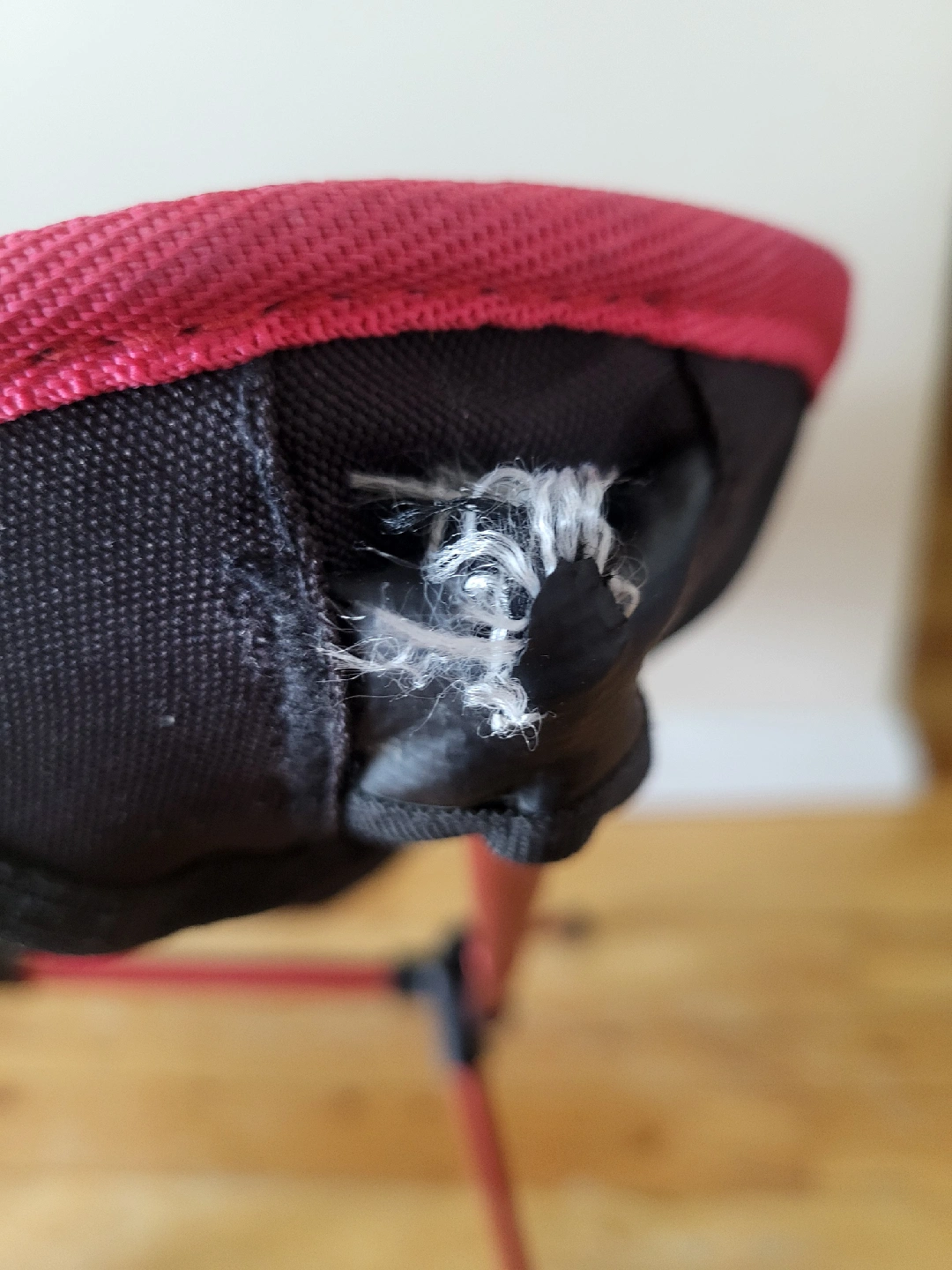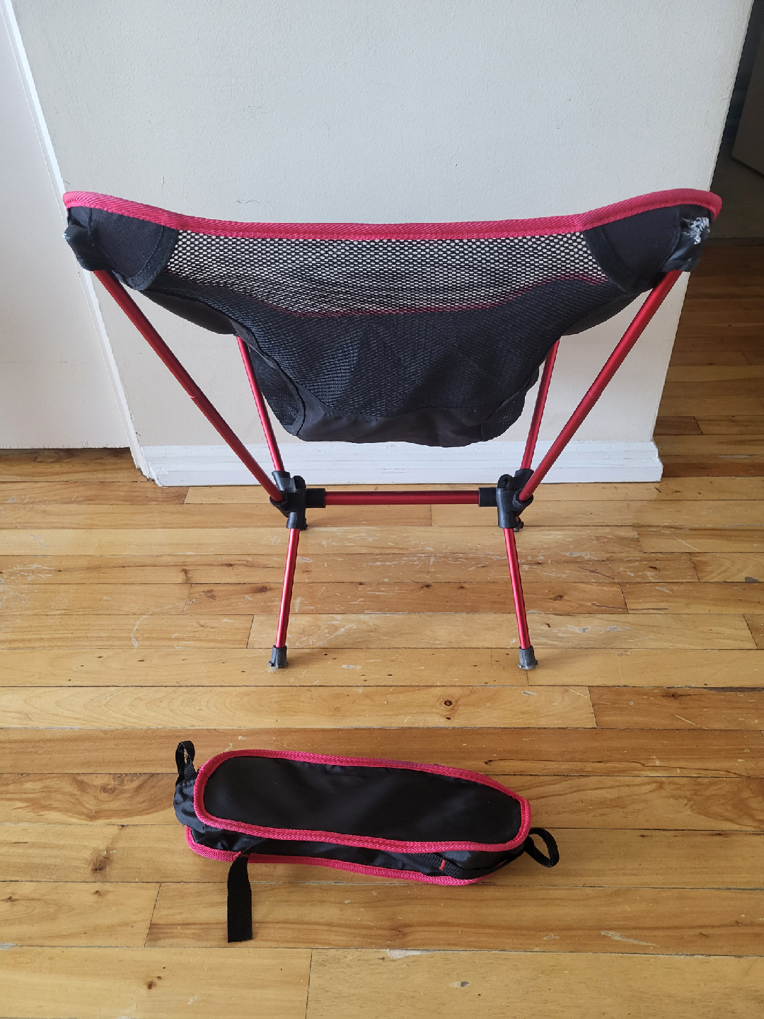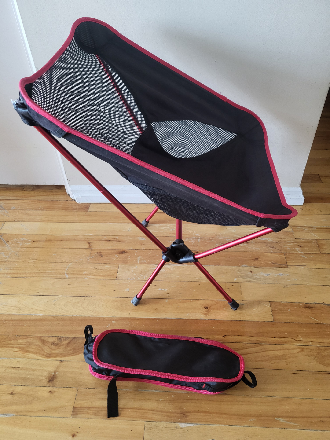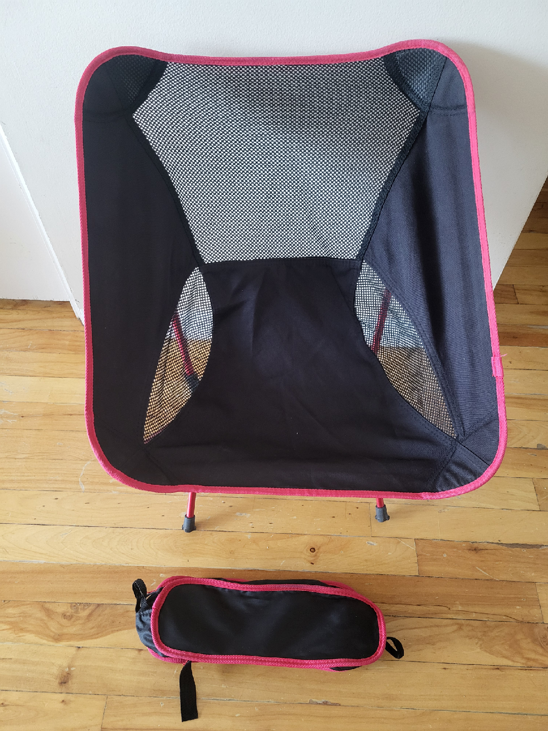 Great lightweight chair, easy to fold up into it's carry bag. It's not in perfect brand new condition as it has been used - please see pictures for details, one stretchy piece needs tucking back in before you add the seat :)