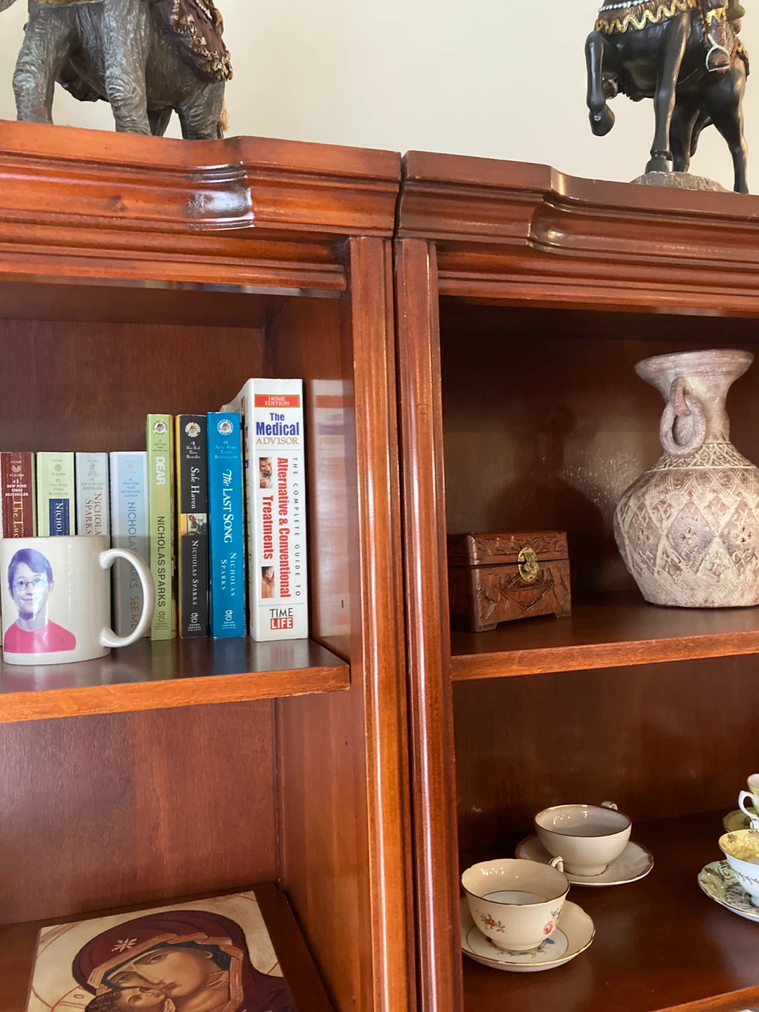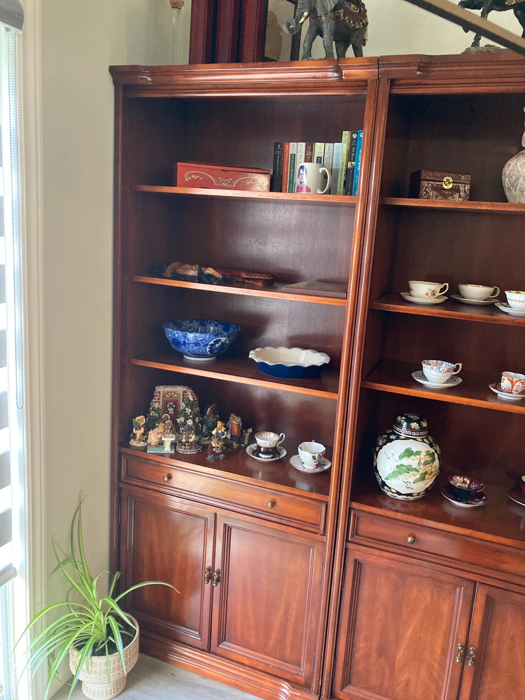 Here's a wooden bookcase with multiple shelves and storage and shelves underneath. It's great for displaying books, or anything else you'd like to showcase. There are some signs of wear and tear, as shown in the photos, but it's still a functional piece of furniture! Or you can refinish it for a totally different look. I’ve always wanted to do it in black but sadly I’m moving to a small apartment and these beauties won’t fit with all my other furniture.