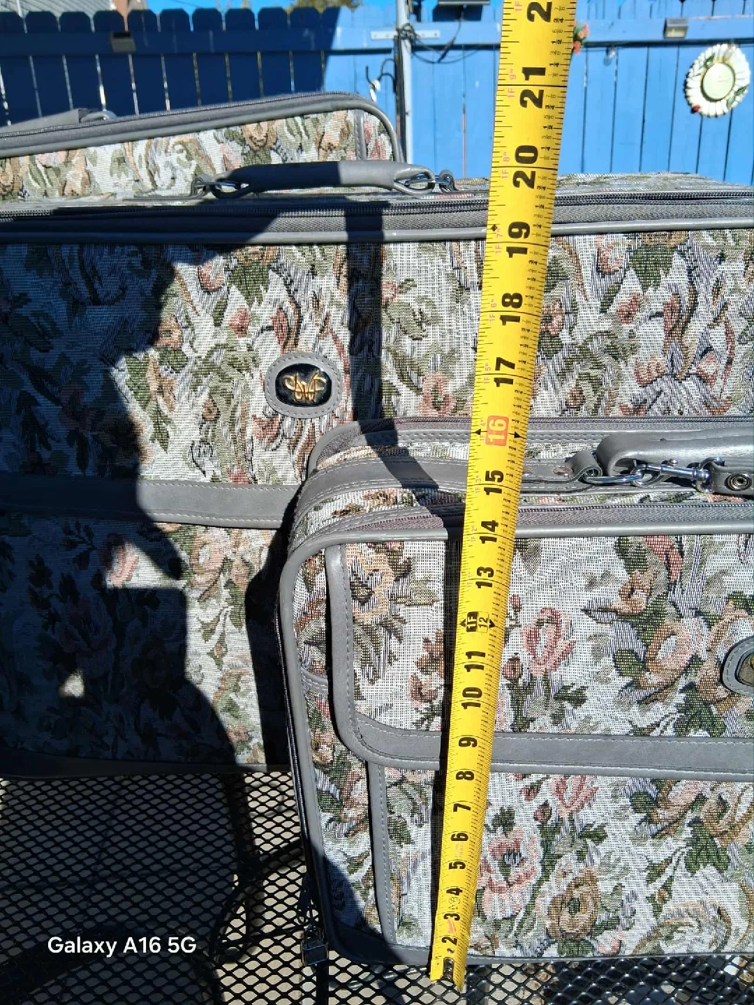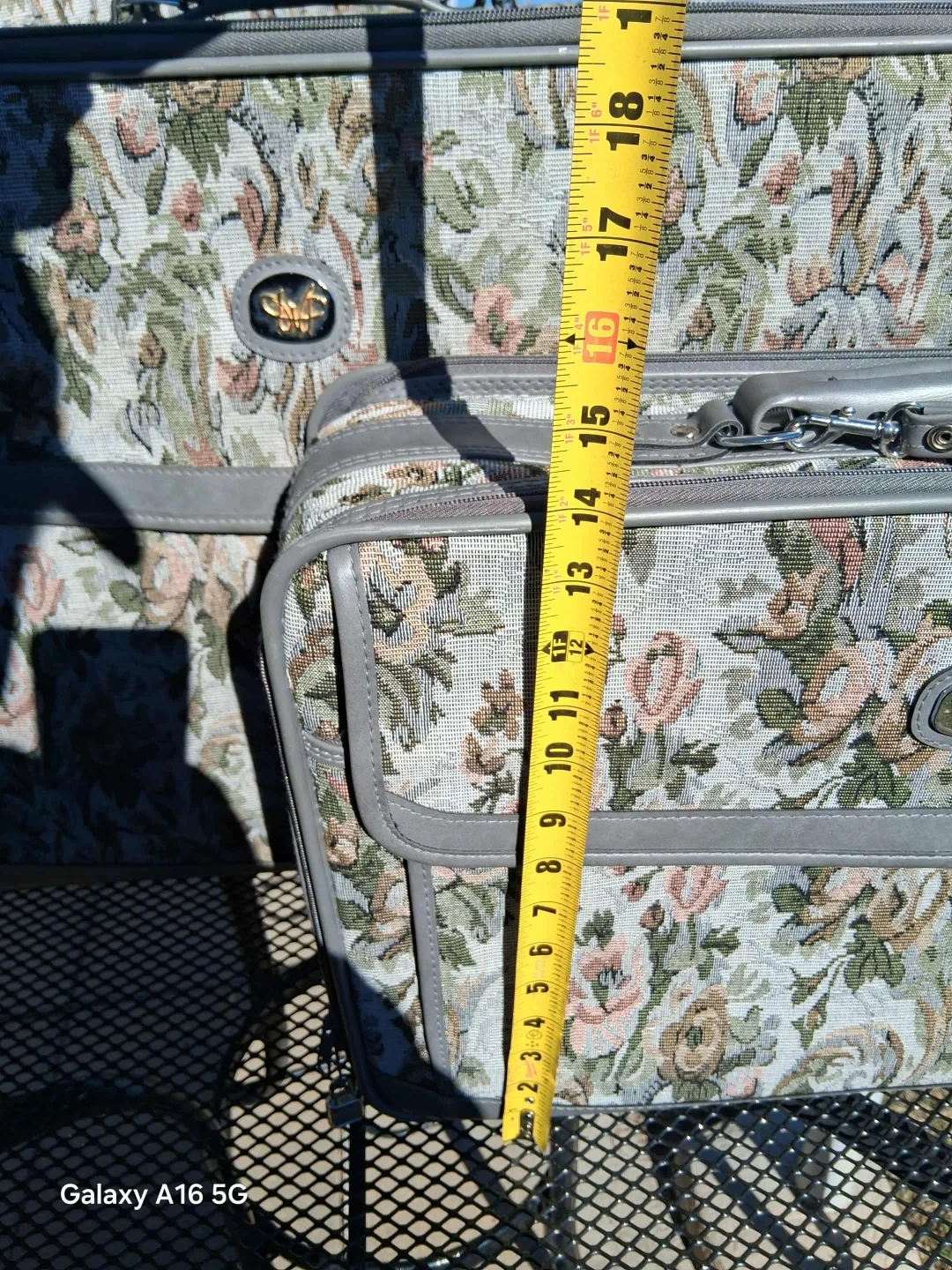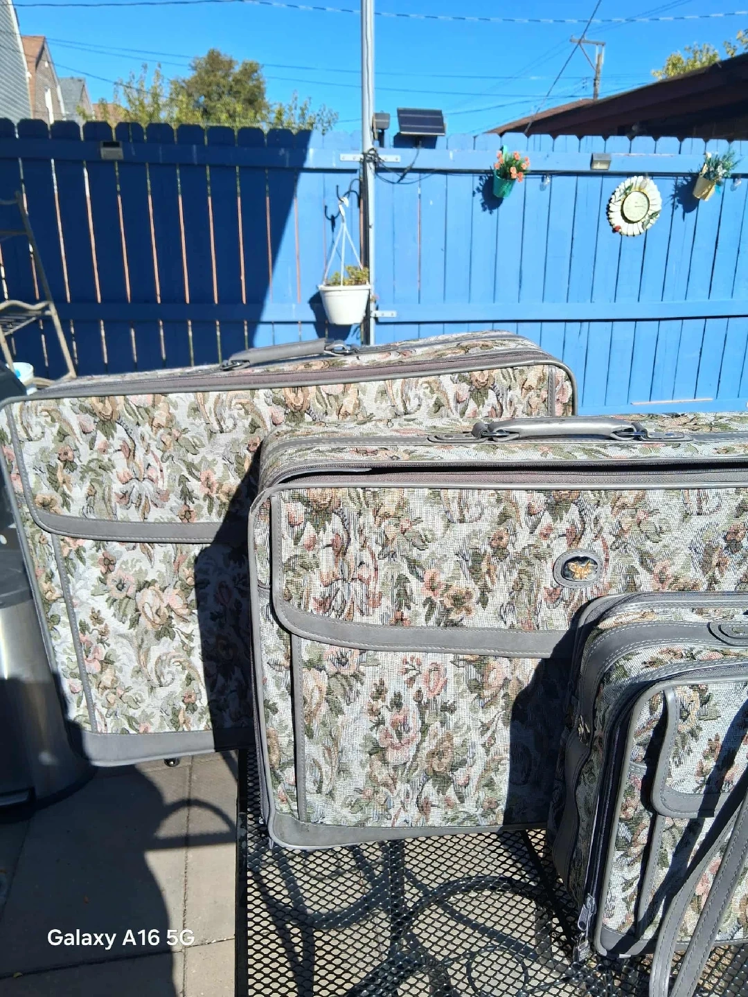 Selling a set of 3 floral patterned suitcases. The largest one is approximately 27 inches long, the medium one is around 21 inches, and the smallest one is about 16 inches. Great for all your travel needs!