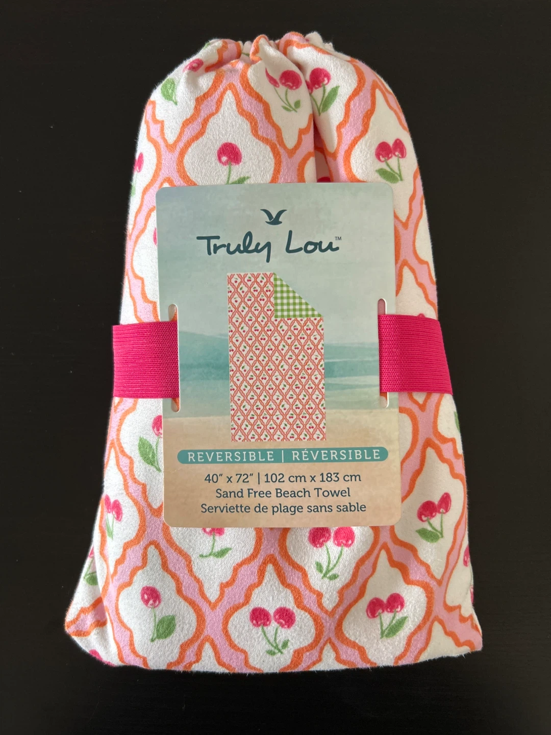 The Truly Lou Reversible Sand Free Beach Towel is quick dry, compact, lightweight and super absorbent. It comes with an elastic hook and matching laundry bag. Brand new, never opened.