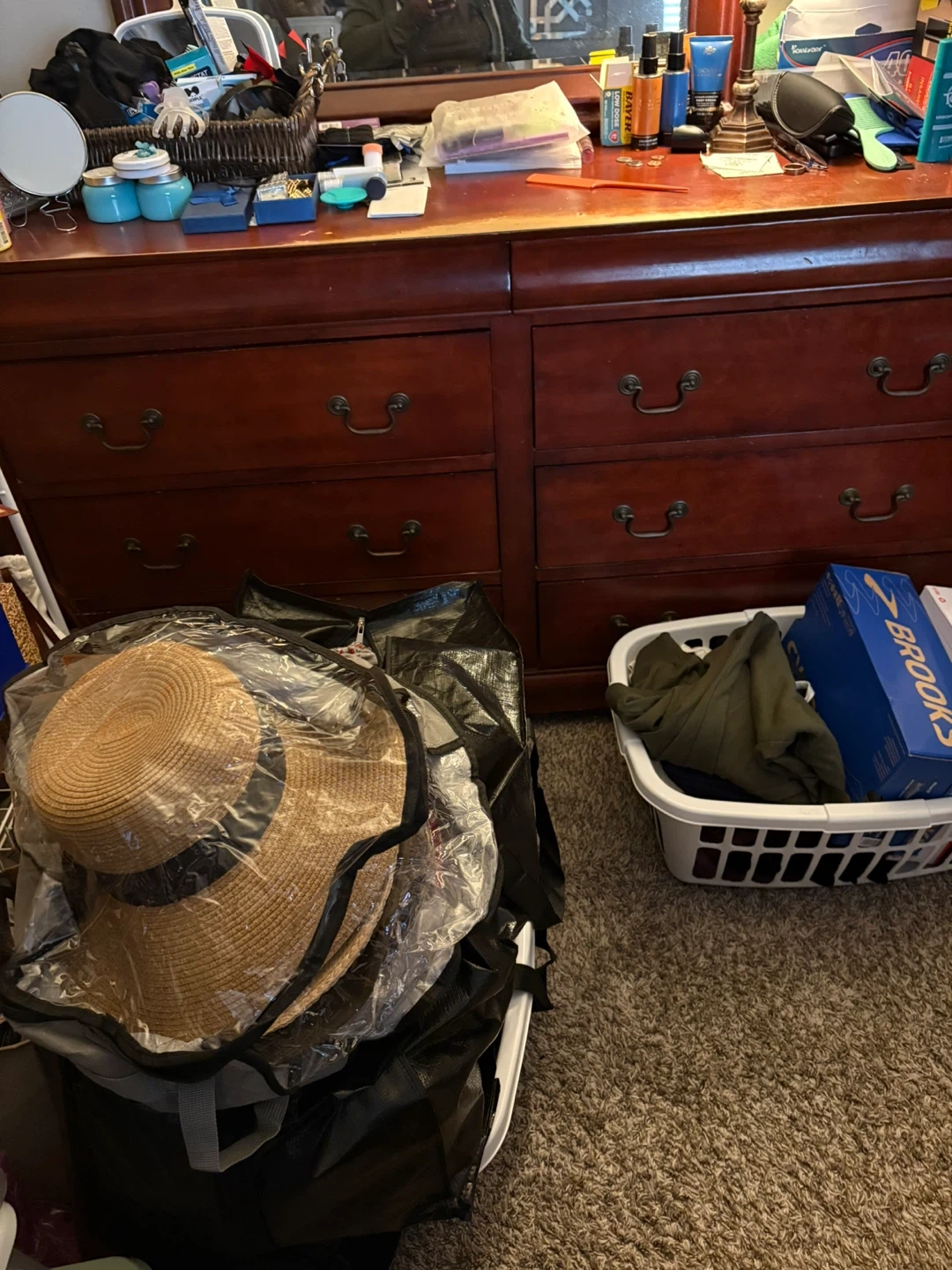 Full-size sofa, bed, loveseat, king bed frame, six drawer chest with two hideaway drawers, and mirror. Needs touch up paint in certain areas but in good shape