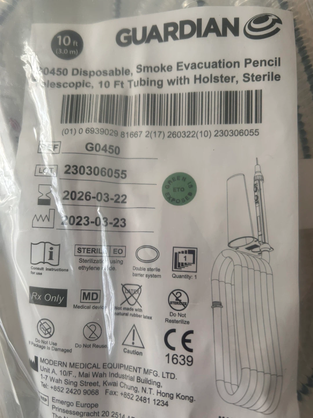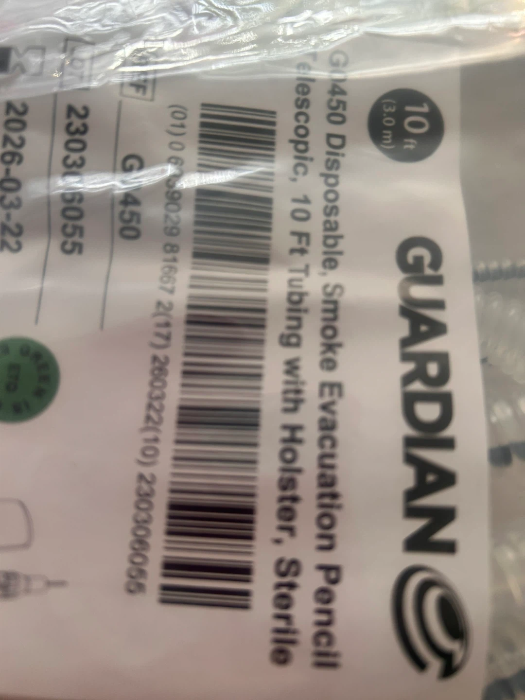 I have 12 pieces Selling a Guardian G0450 Disposable Smoke Evacuation Pencil with Telescopic 10 Ft Tubing and Holster. It's sterile and in its original packaging. Expiry Date: 2026 March 22