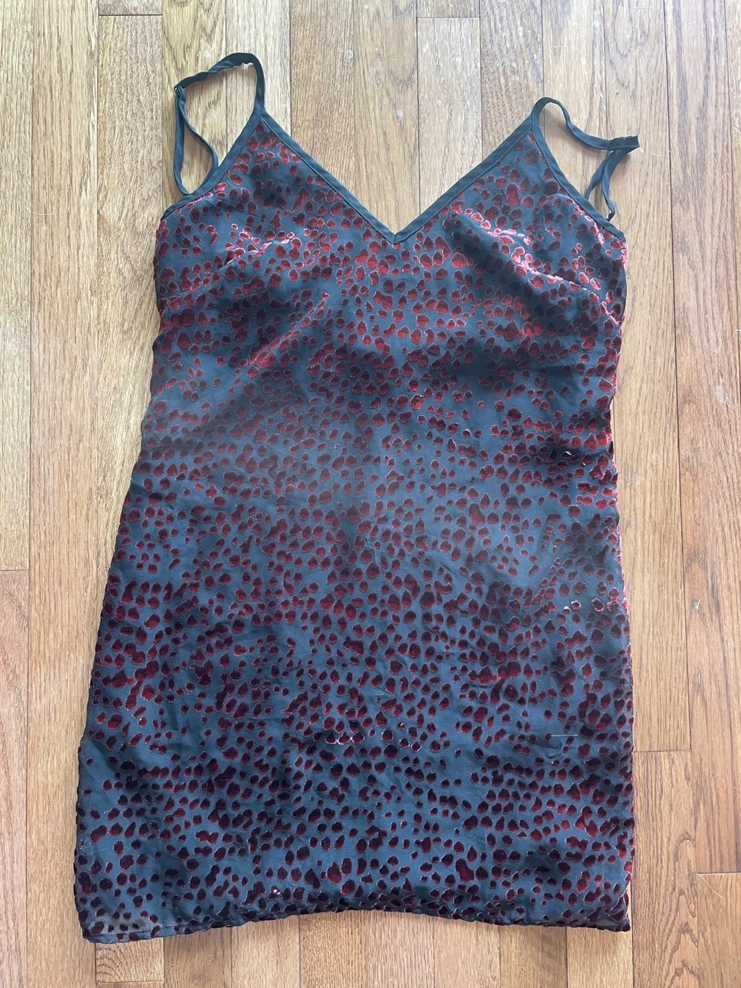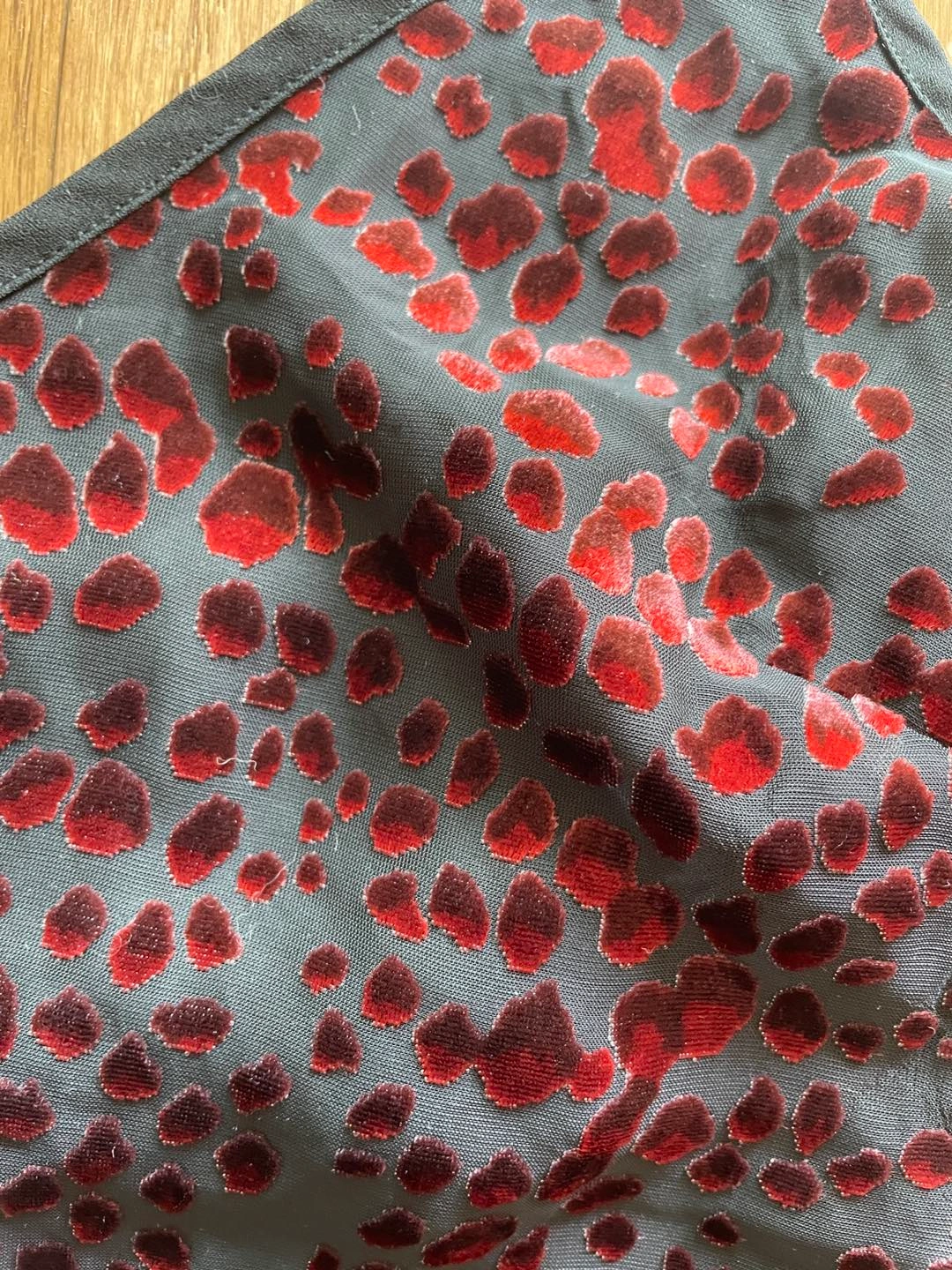 Velvety red pattern on a black background. Super cute for dancing, and I love the cowl back! Perfect for a spicy summer 🥵
