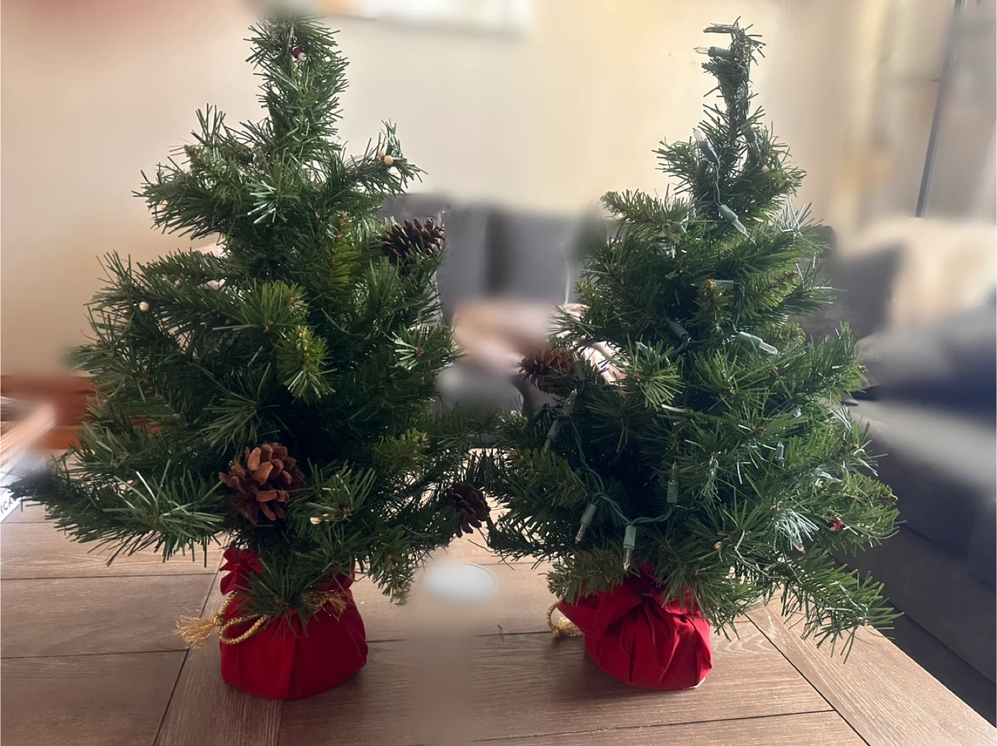 Selling a cute pair of mini Christmas trees! They each have pinecones and are in red fabric pots. Perfect for adding a touch of holiday cheer to any small space. 24in