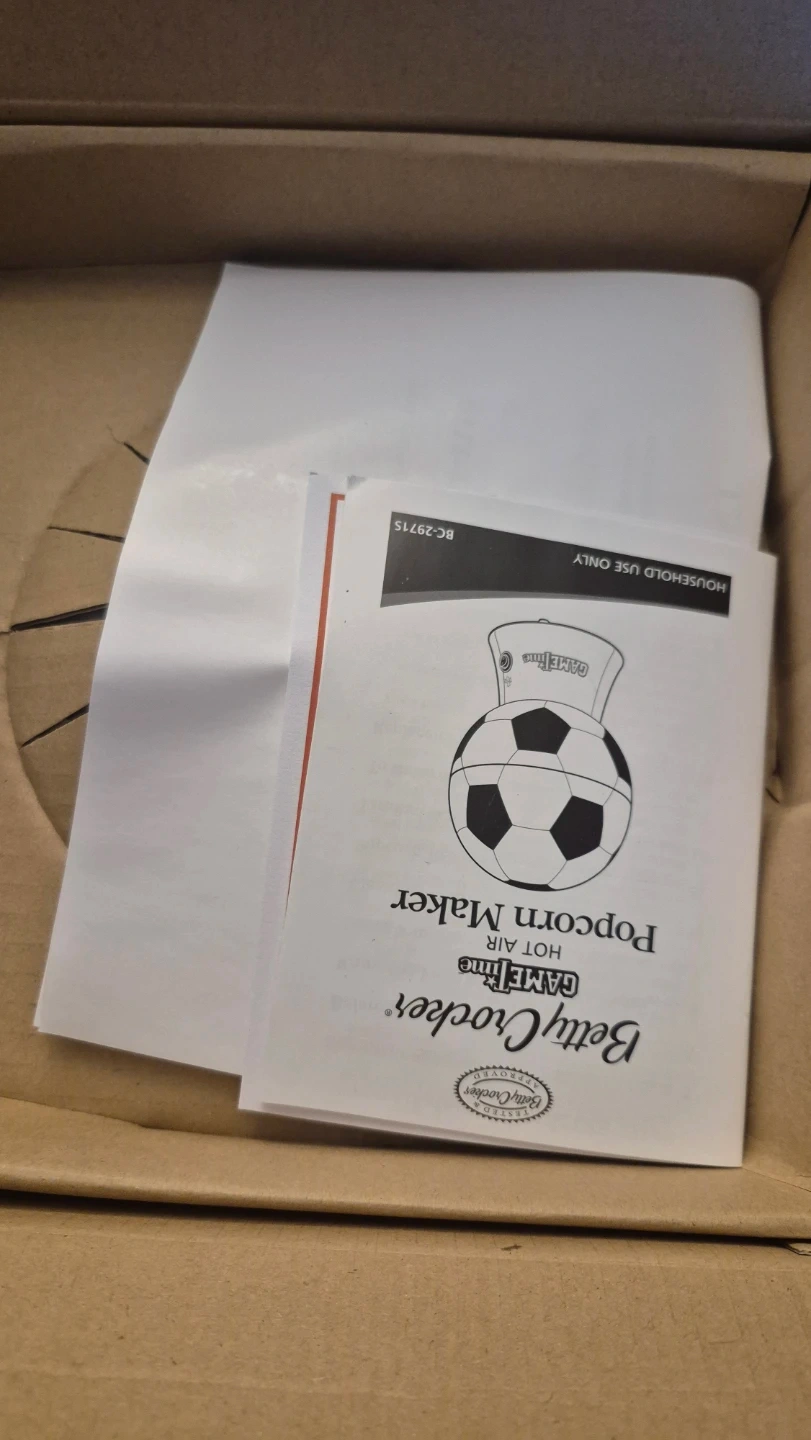 Get ready for game night with this Betty Crocker Game Time Football Hot Air Popcorn Maker! It's lightweight and portable, so you can easily bring it out for any occasion. The popcorn chamber pops up to 8 cups in just a few minutes. The measuring cup doubles as a butter melting tray, and the cover can be used as a serving bowl. Box included! Prefect Xmas gift.