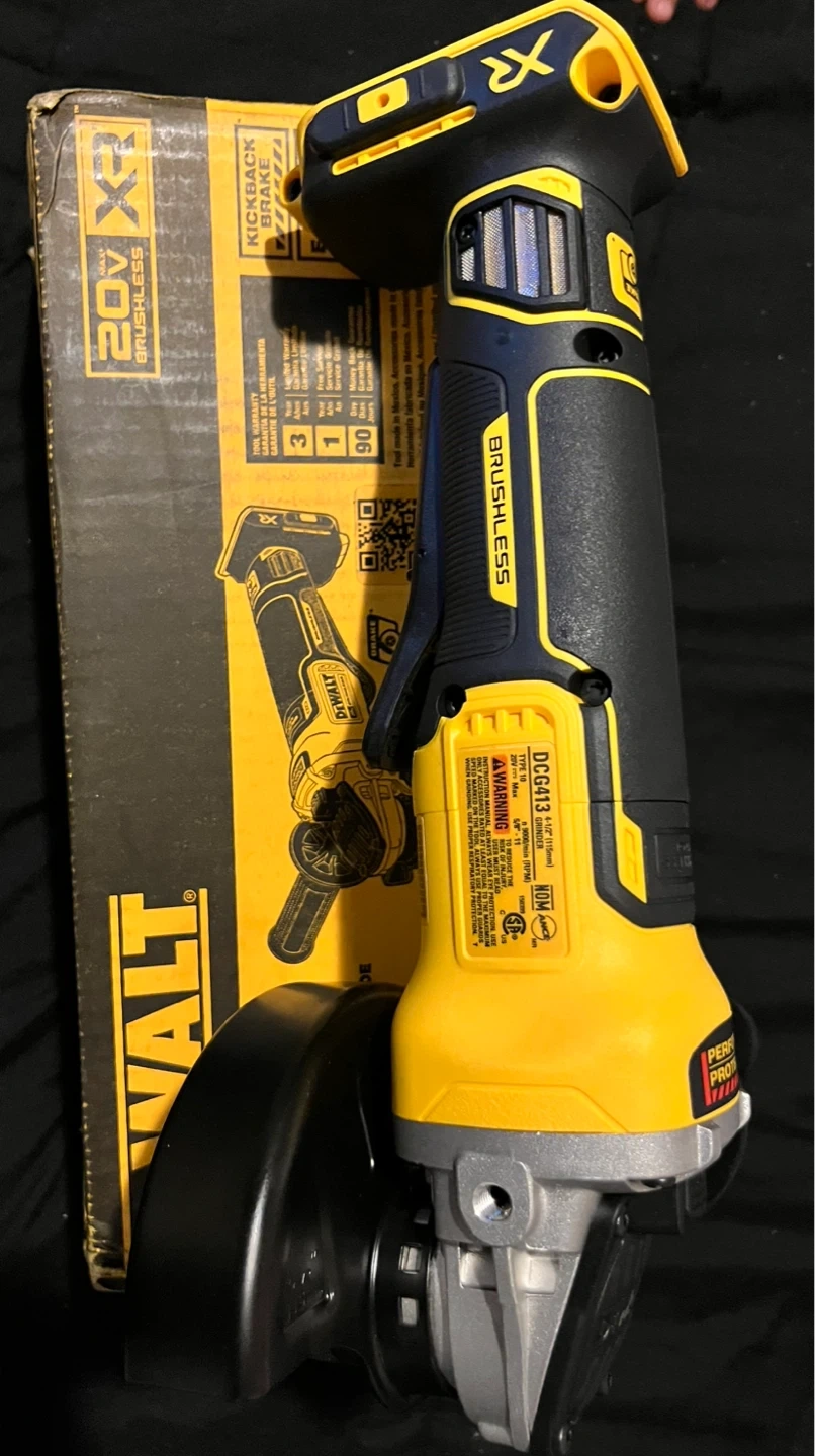 Selling a DeWalt 4.5" (115 mm) Angle Grinder with Brake (tool only). This is a 20V XR brushless model. The box includes information about the E-Clutch and Kickback Brake features. Originally bought for $249