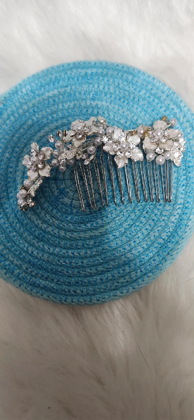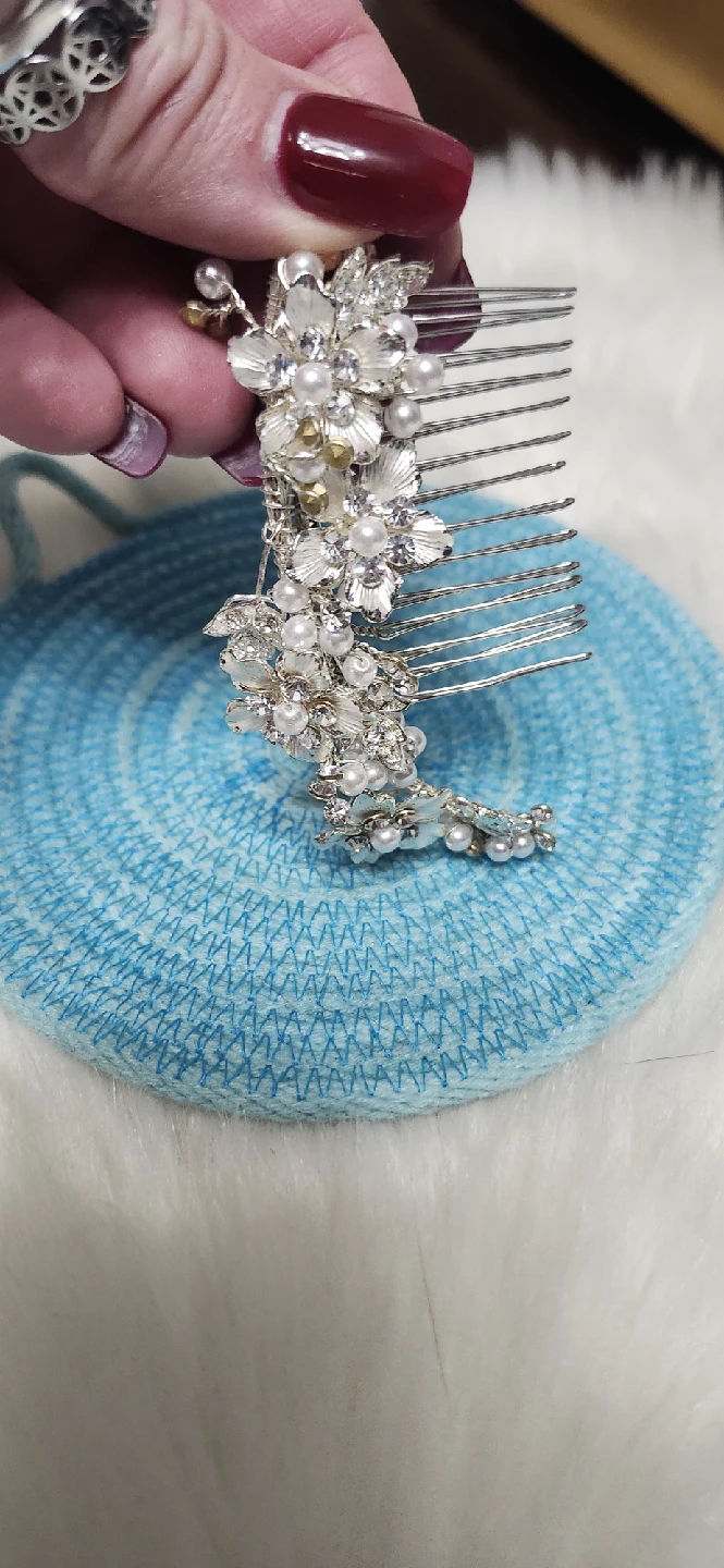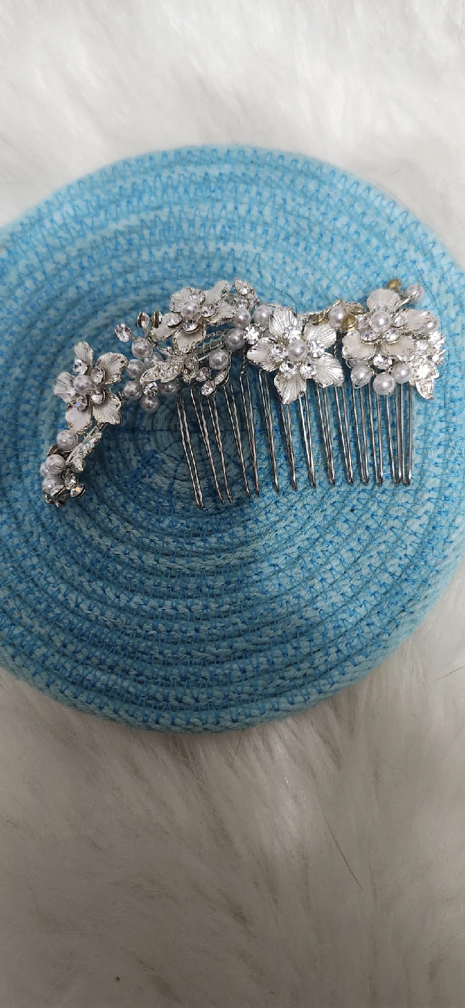 This is a lovely hair comb with a floral design, adorned with pearls and rhinestones. It would be perfect for a special occasion or to add a touch of elegance to your everyday look.