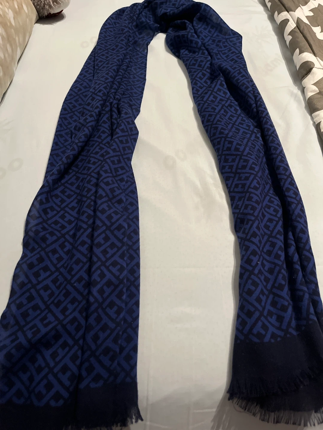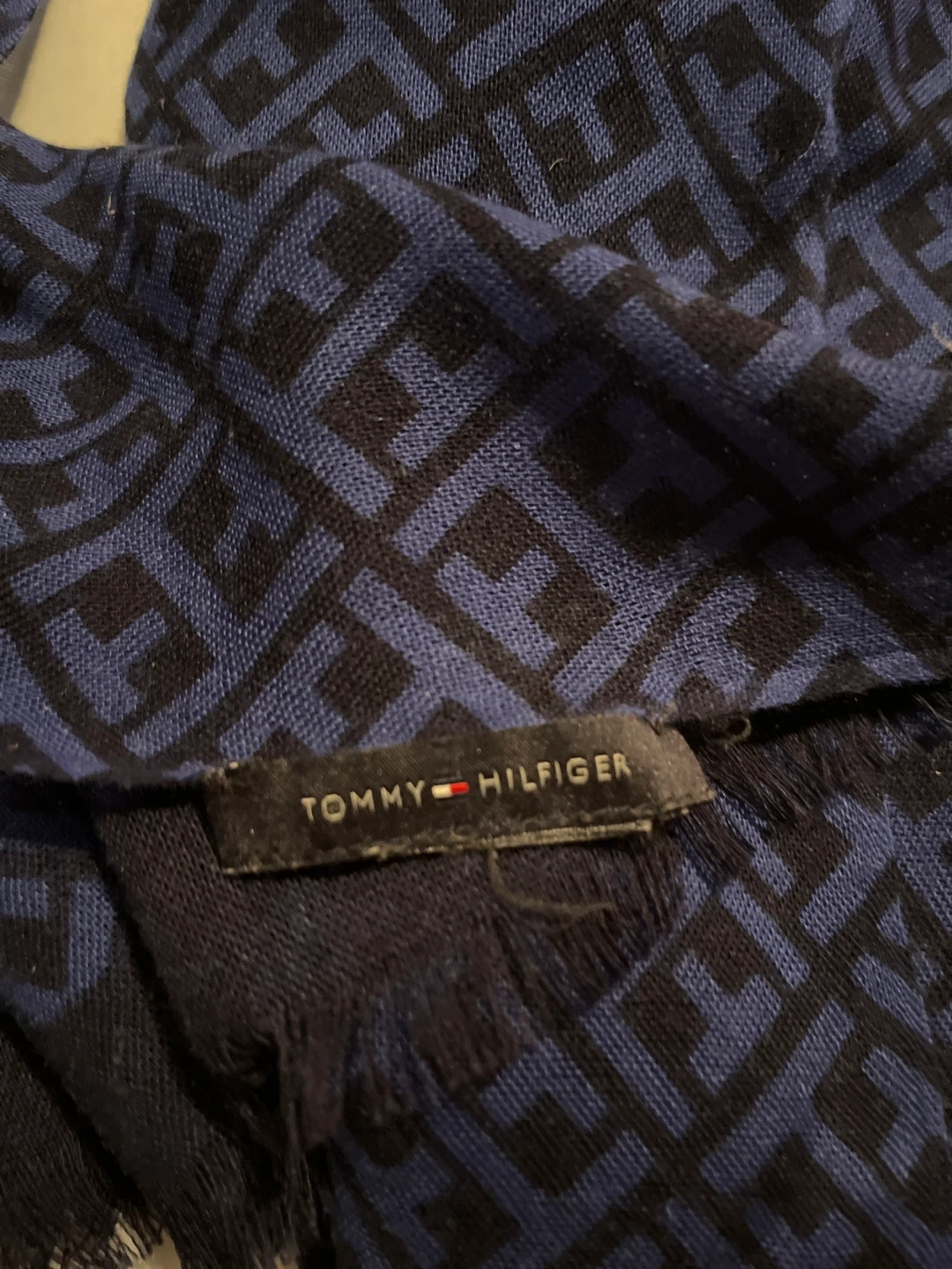Here's a lovely Tommy hilfigure scarf in a beautiful shade of blue! It features the iconic logo pattern throughout. It's in great condition and ready to add a touch of luxury to your wardrobe