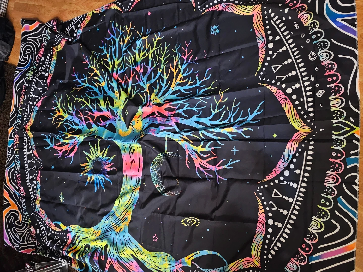 Add a splash of colour and a touch of bohemian flair to your space with this vibrant Tree of Life tapestry! The design features a colourful tree with celestial elements like the sun and moon on a black background. Perfect as a wall hanging, bedspread, or even a picnic blanket!Works awesome in Blacklight !!