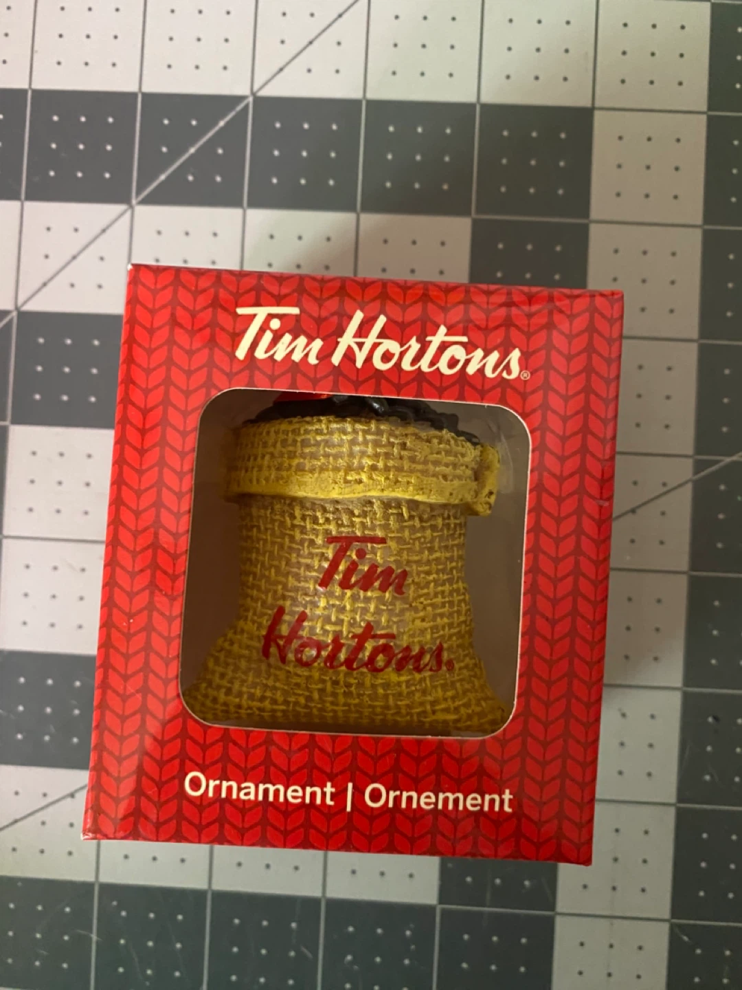 Selling a Tim Hortons ornament still in its box! It's a cute little burlap sack with the Tim Hortons logo on it.