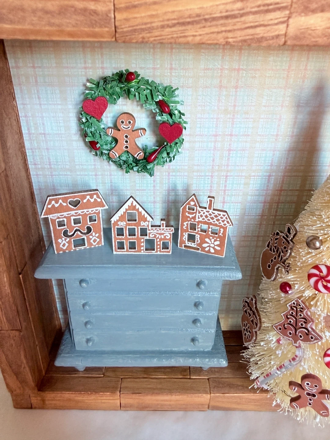 This miniature display features a charming Christmas scene! It includes a wooden frame, a miniature Christmas tree, a tiny dresser, and cute gingerbread decorations. Batteries can be replaced. 20 cm x 20 cm x 4.5 cm