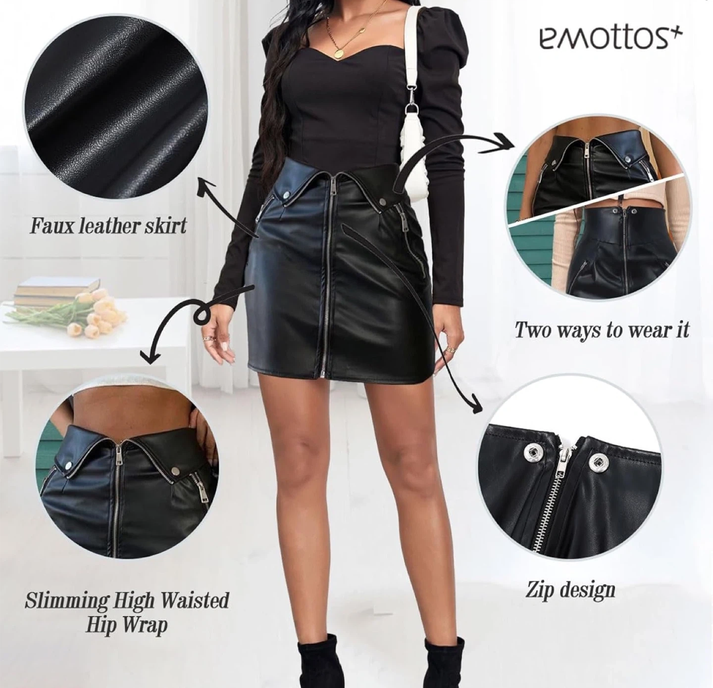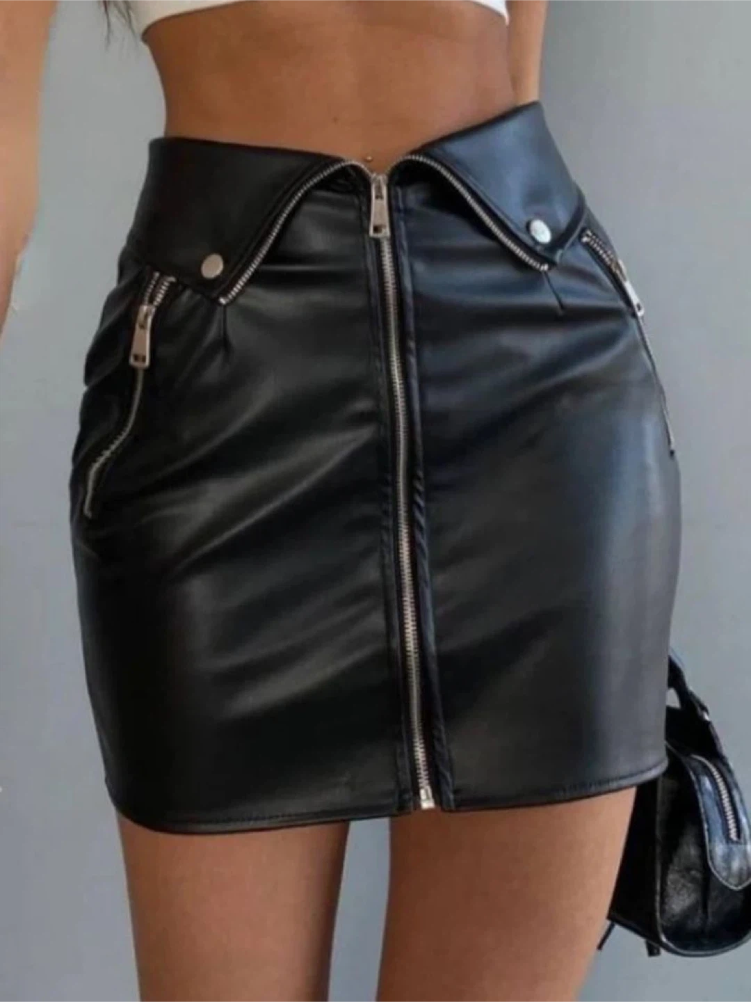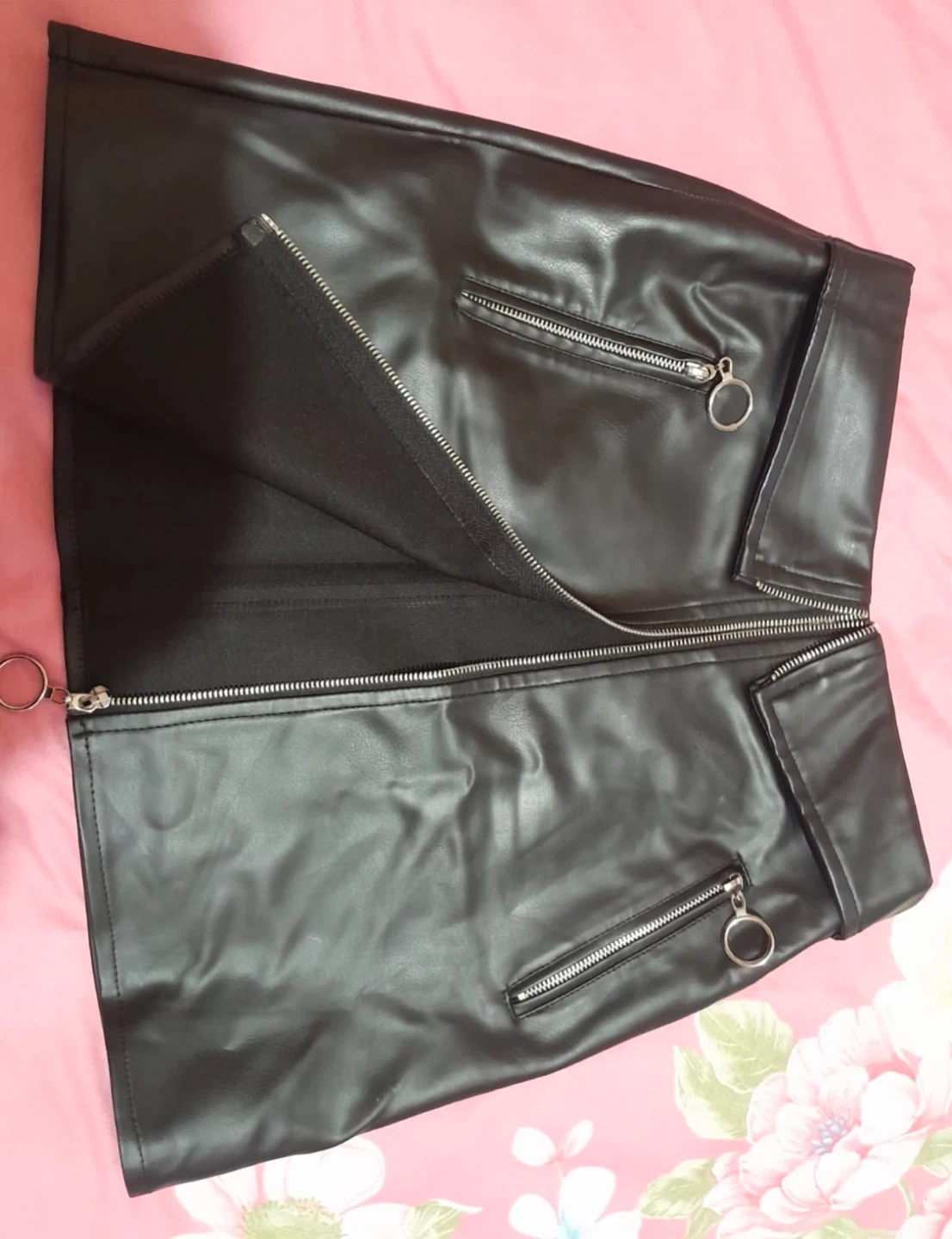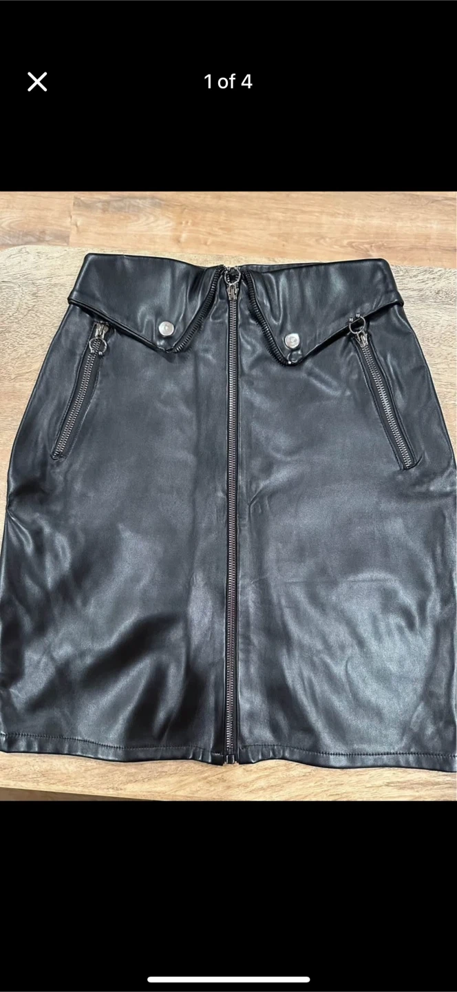 Stylish black faux leather mini skirt. Features a front zipper closure, zipper pockets, and a unique collar detail. Size 1 which fits small to medium