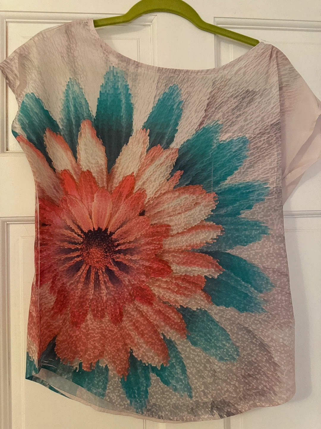 334Here's a beautiful Barami top with a unique floral print! It's perfect for adding a pop of color to your wardrobe. The material feels lightweight and comfortable, making it great for warm weather. It's in excellent condition and ready for a new home