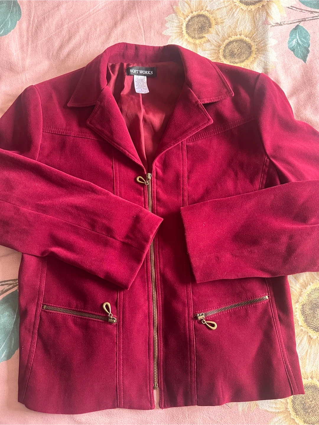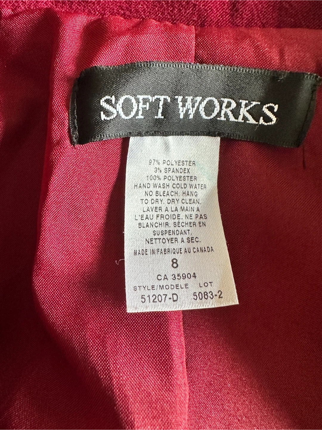 This Soft Works jacket is in great condition and ready for a new home! It's a lovely burgundy colour and a size 8. The material is 97% polyester and 3% spandex, making it comfortable to wear. Made in Canada!