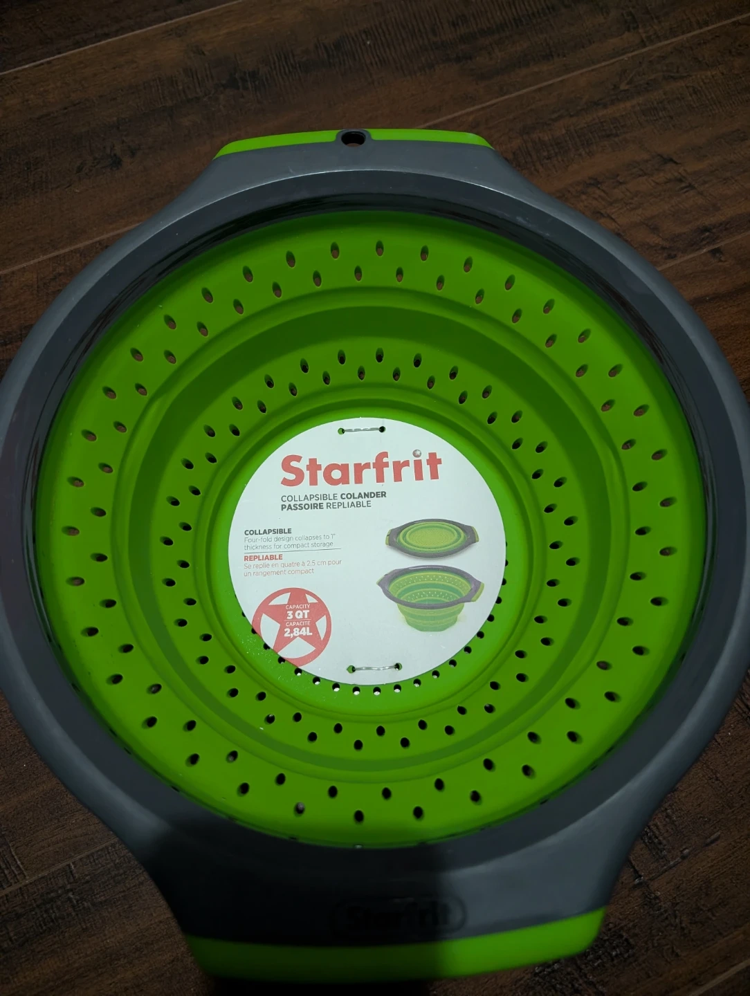 Selling a Starfrit collapsible colander in excellent condition! It's perfect for saving space in your kitchen. This colander collapses to 1" for compact storage. It holds 3 quarts (2.84L). It's also heat-resistant and dishwasher safe for easy cleaning