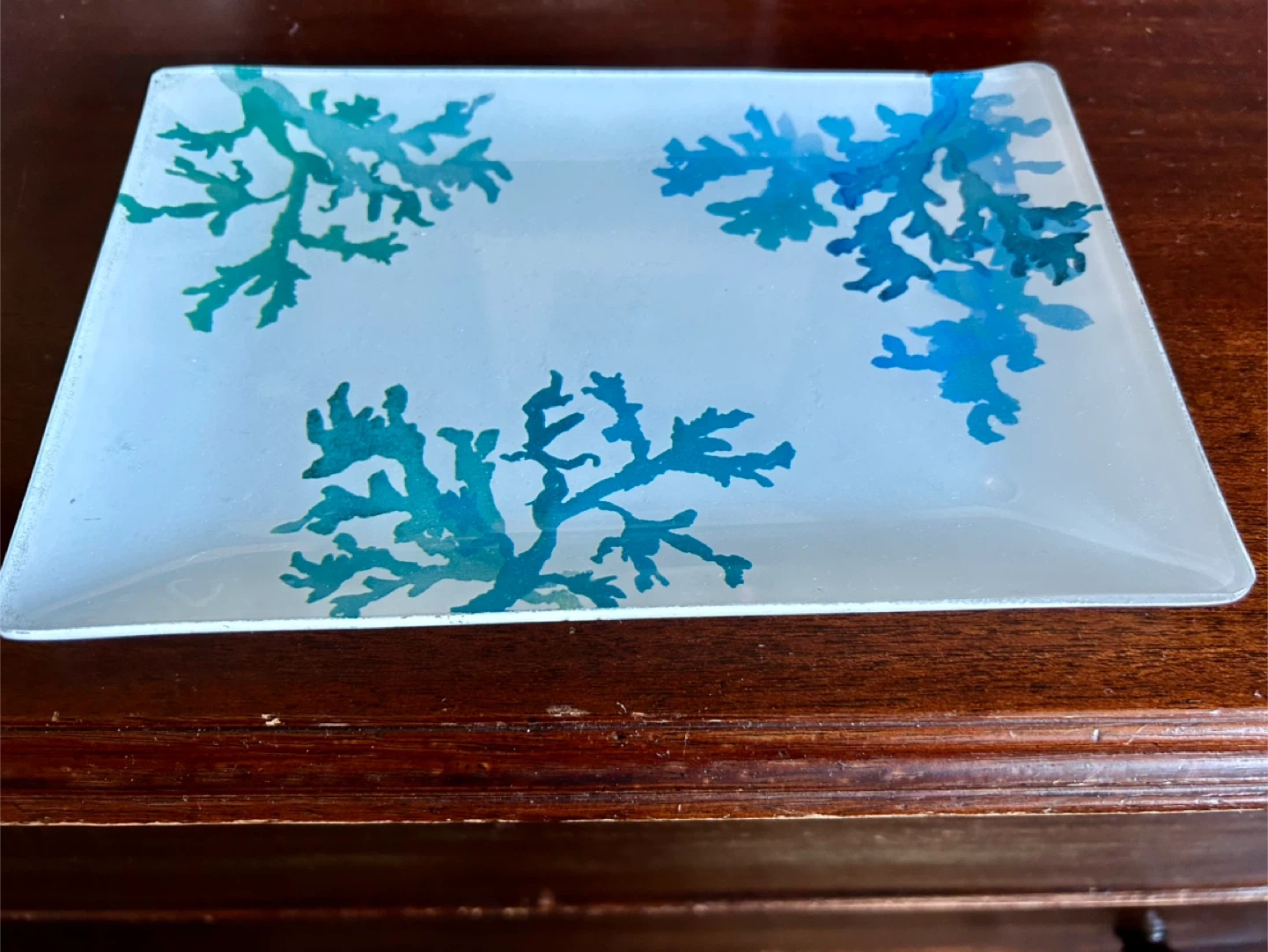 Here's a lovely decorative glass tray! It features a beautiful blue and teal coral design. It would be a great addition to any home decor. Purchased at West Elm. Beautiful way to store jewelry.