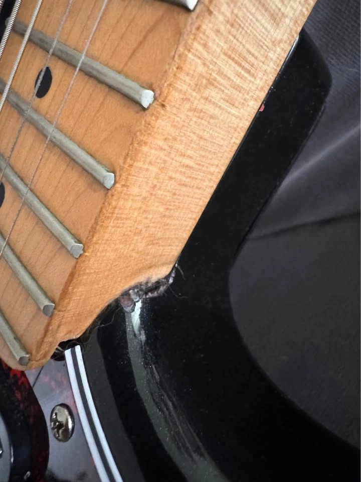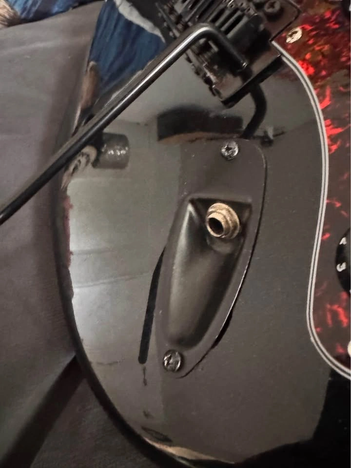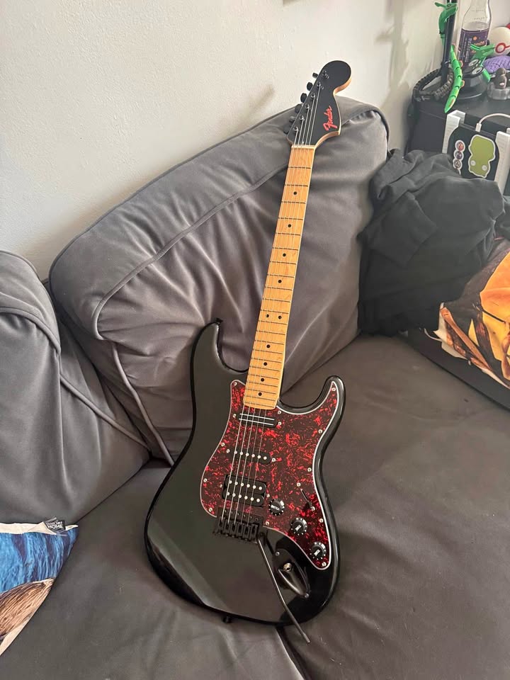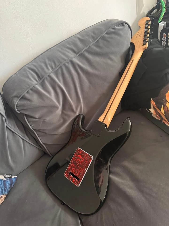 Parts caster guitar I’ve been building for many years that started as a squire Strat, a few imperfections on the body, the middle pickup is not hocked up and the toggle switch is a 3 way toggle for the bridge and neck pickup respectively. Great little guitar project, plays great just hast gotten enough love from me anymore. Needs new strings as well, the ones on it are pretty old and it’s missing its high E string.