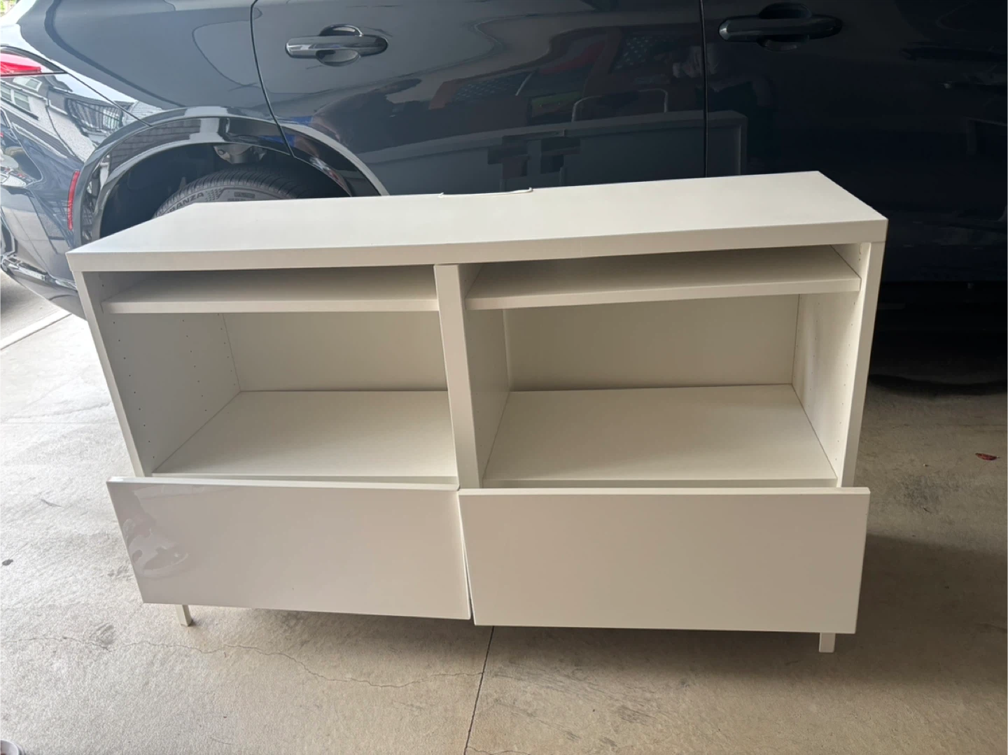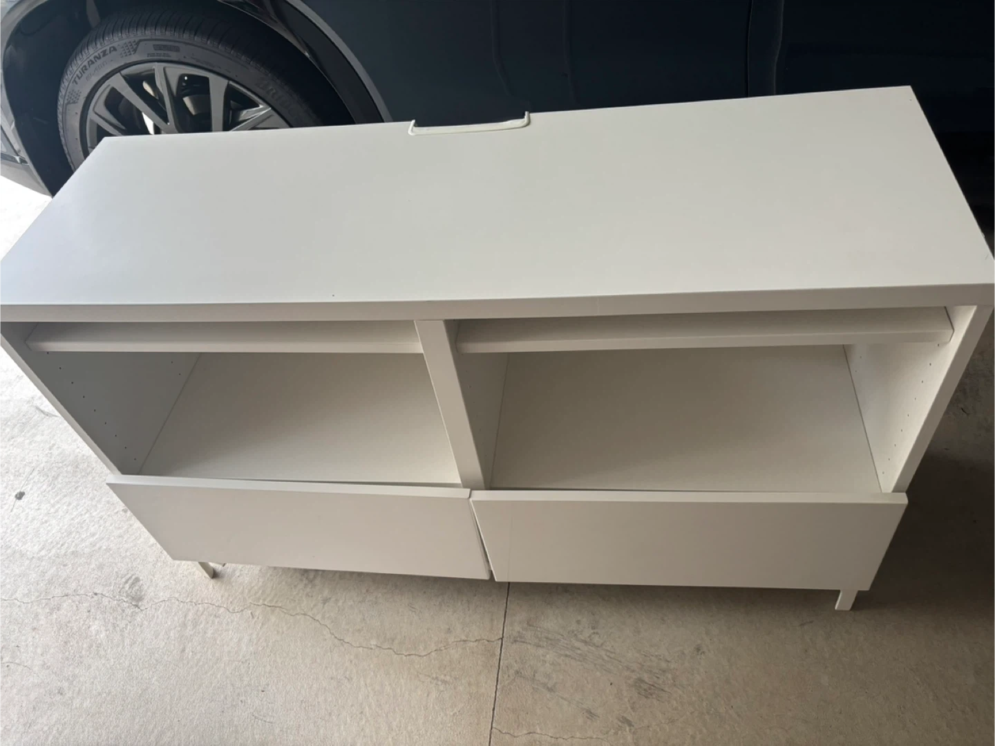 Stylish and sturdy TV stand with shelves and drawers for storage. Clean, solid, and ready to use!