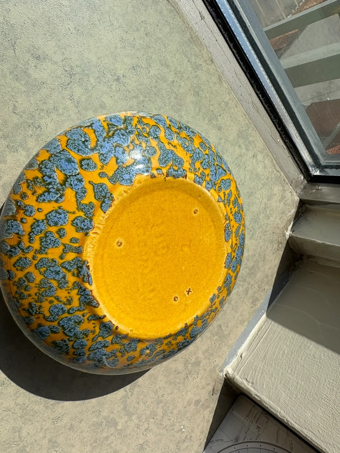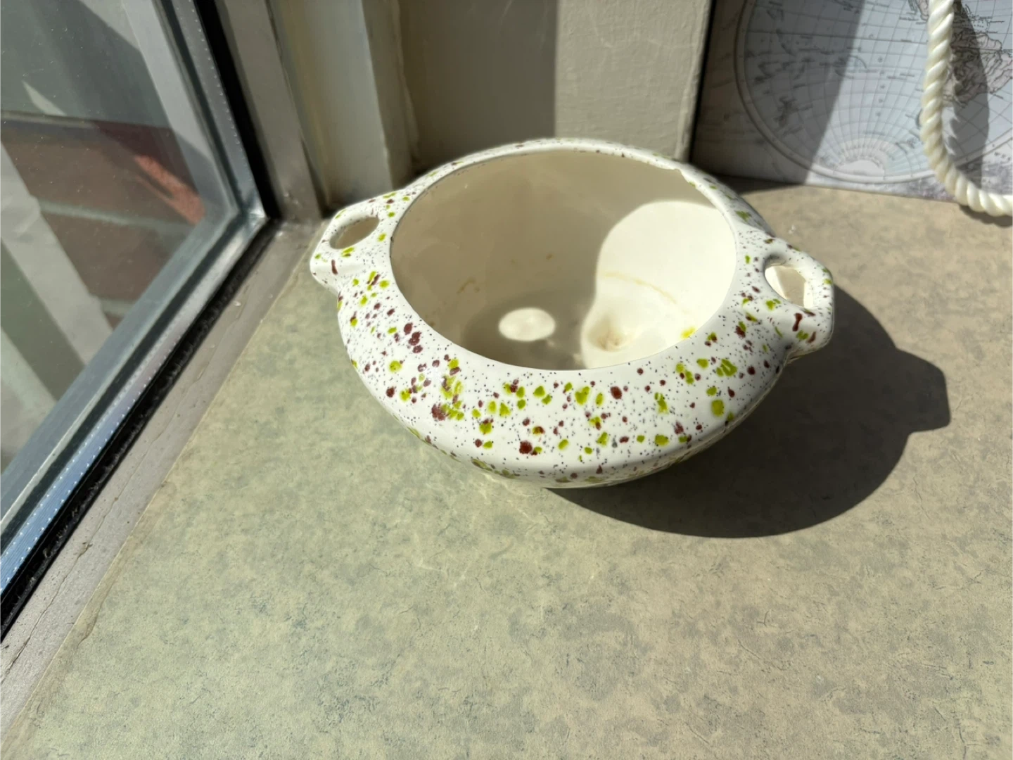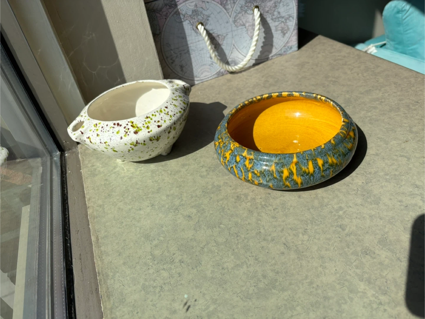 Here's a lovely set of vintage decorative ceramic planter bowls. One has a unique yellow and blue pattern. The other is white with flecks of green and brown. They would look great with plants or on its own as a decorative piece!