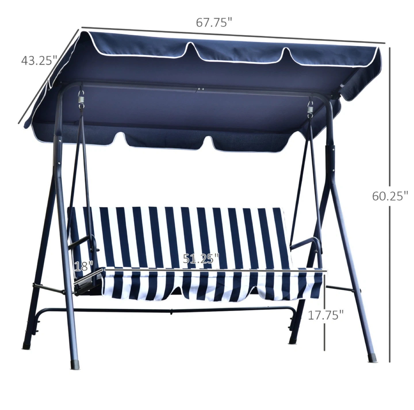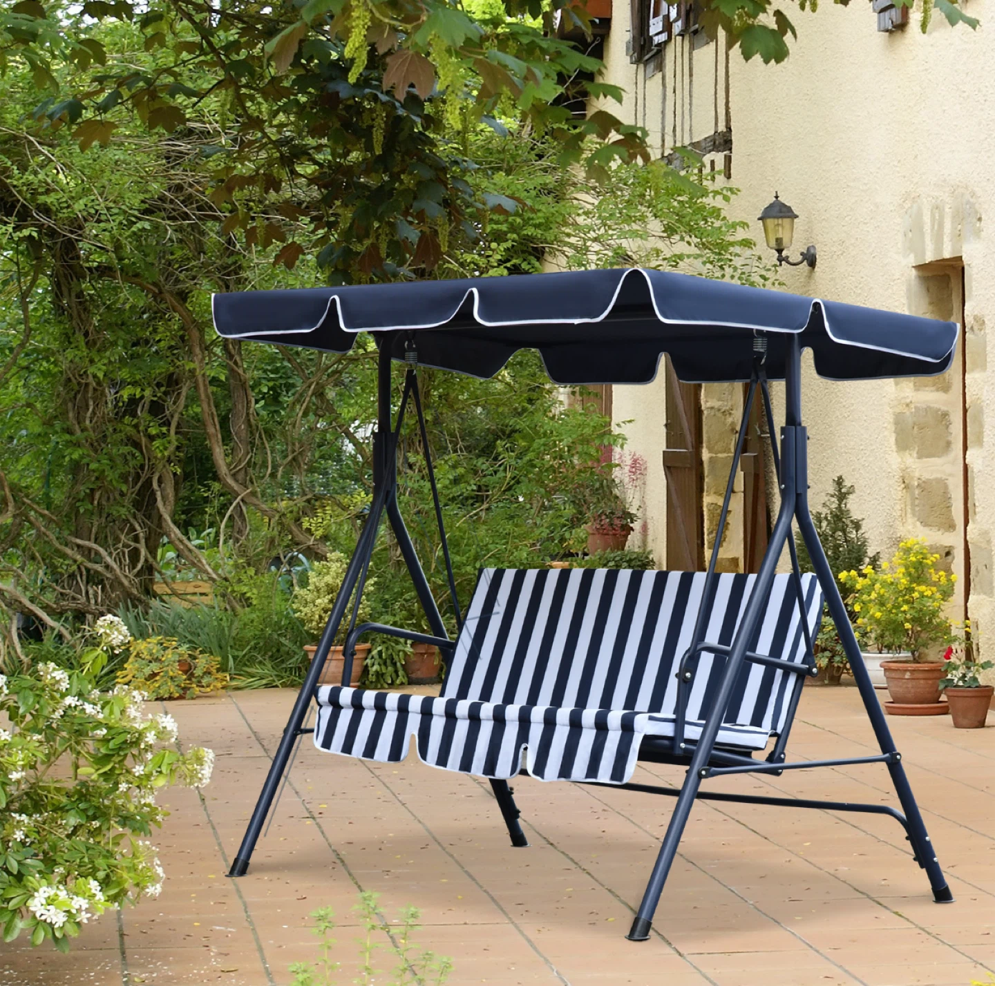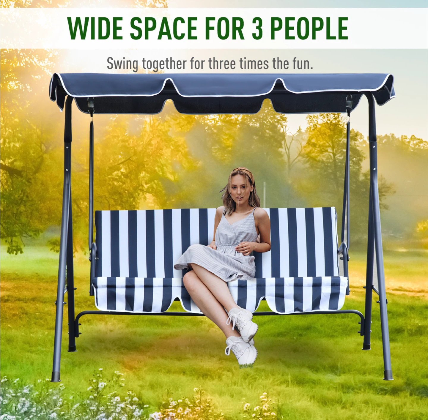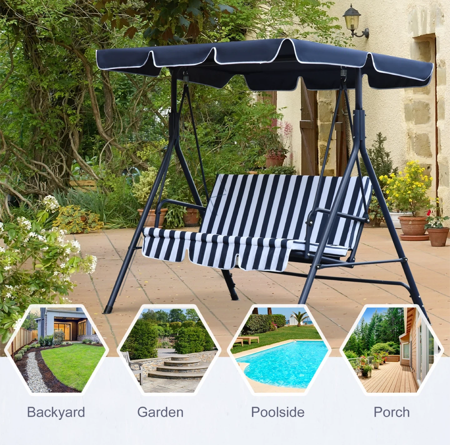 Looking to add a comfy spot to your patio? This 3-person outdoor swing chair could be just the thing! It's got a weather-resistant and adjustable canopy, so you can change the angle throughout the day. The frame is made of solid and rust-resistant powder-coated steel, and it has non-slip foot pads for extra stability. Plus, the seating angle is designed for comfort, complete with armrests. Perfect for relaxing outdoors!