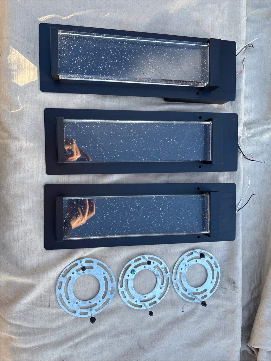 Selling a set of three wall sconces! They feature a sleek black frame with a textured glass insert that gives off a really nice light. Mounting hardware is included as pictured.