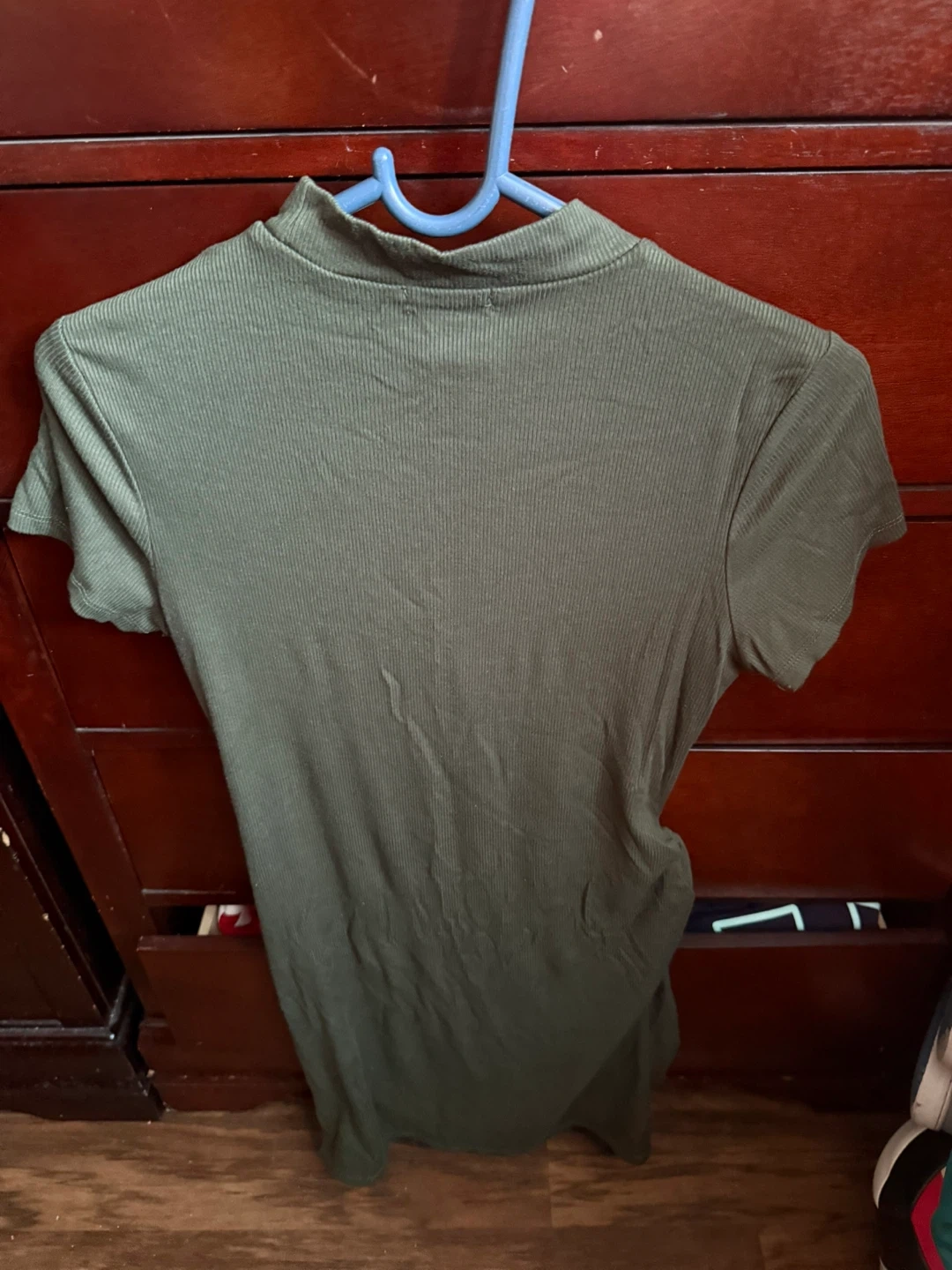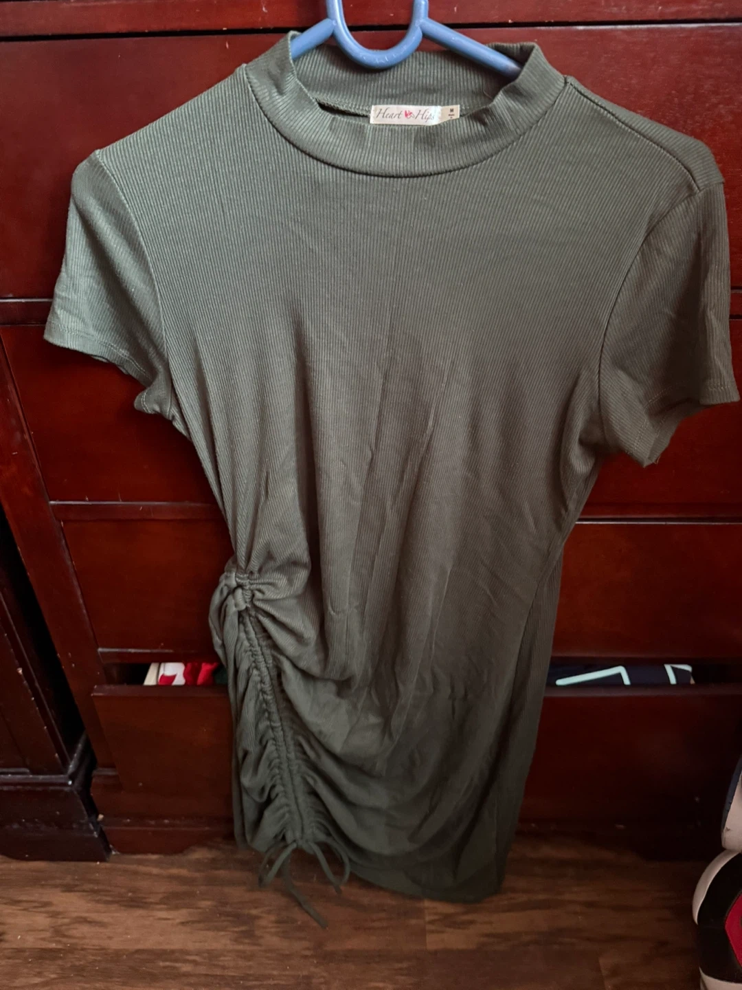 Ribbed knit dress with a ruched side detail. Mock neckline and short sleeves. It's a versatile olive green color.