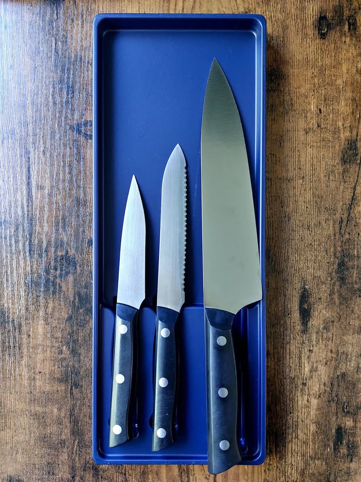 The 5 and 4-inch knives have been lightly used; the 8-inch has not. All are in excellent condition. Sold as a set.