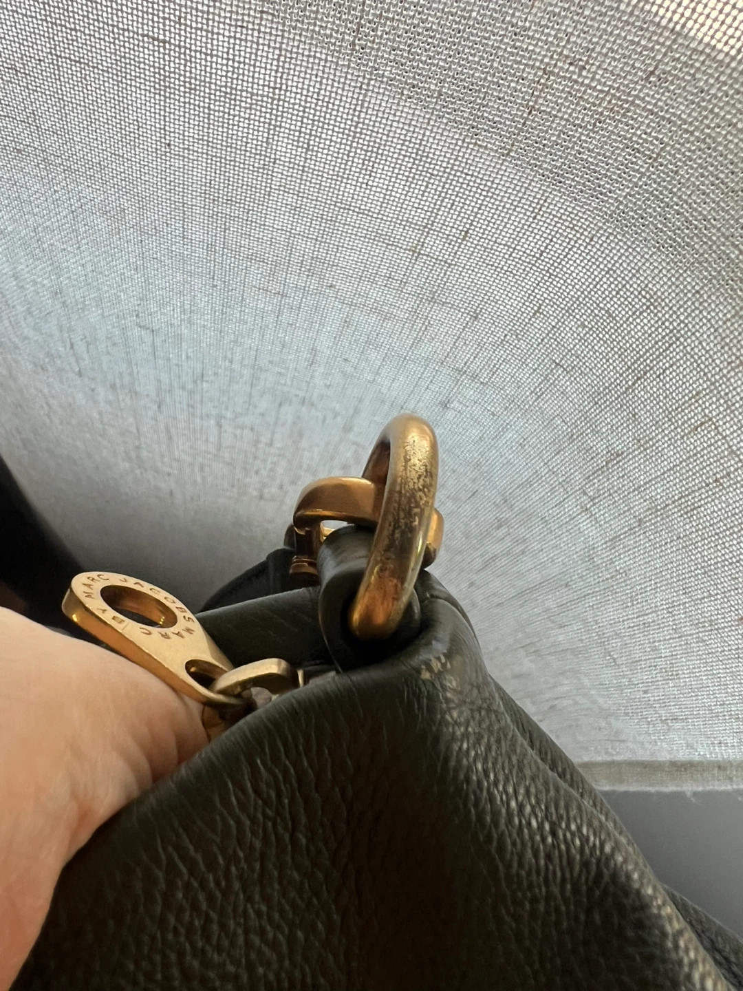 Selling a cute Marc by Marc Jacobs crossbody bag in olive green. It's a great size for everyday use and has a stylish interior lining with the brand's name printed on it. The leather has a nice texture, and the gold-tone hardware adds a touch of elegance.