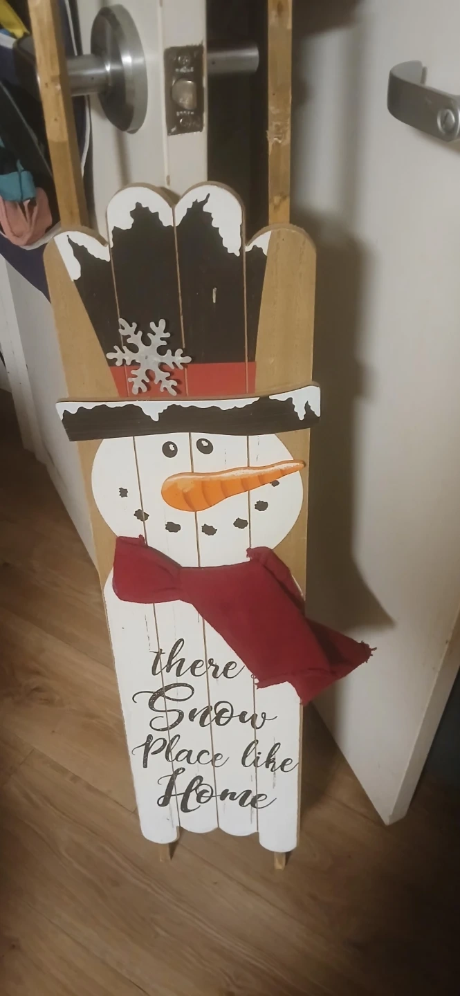 This is a cute wooden snowman porch sign that reads, "There's Snow Place Like Home"! It's perfect for adding a festive touch to your entryway during the winter season