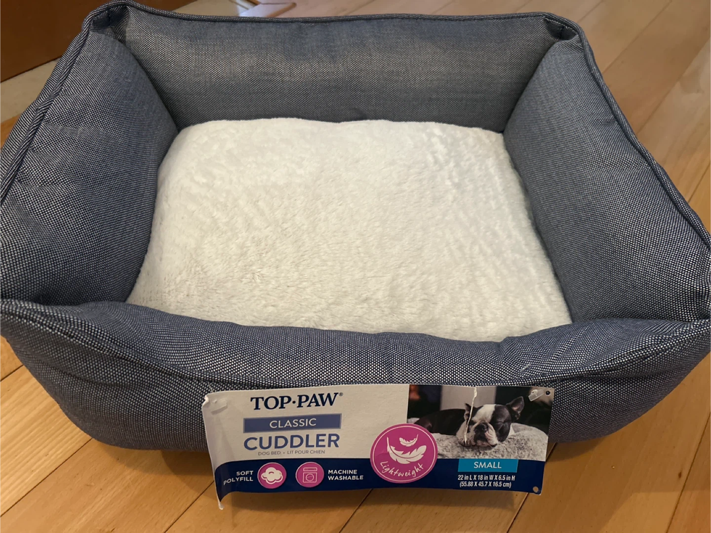 Never used. Selling a Top Paw Classic Cuddler dog bed in size small. It's lightweight and machine washable, making it super convenient. The bed is filled with soft polyfill, ensuring your furry friend has a comfy place to rest. Dimensions are 22 in L x 18 in W x 6.5 in H (55.88 x 45.7 x 16.5 cm)
