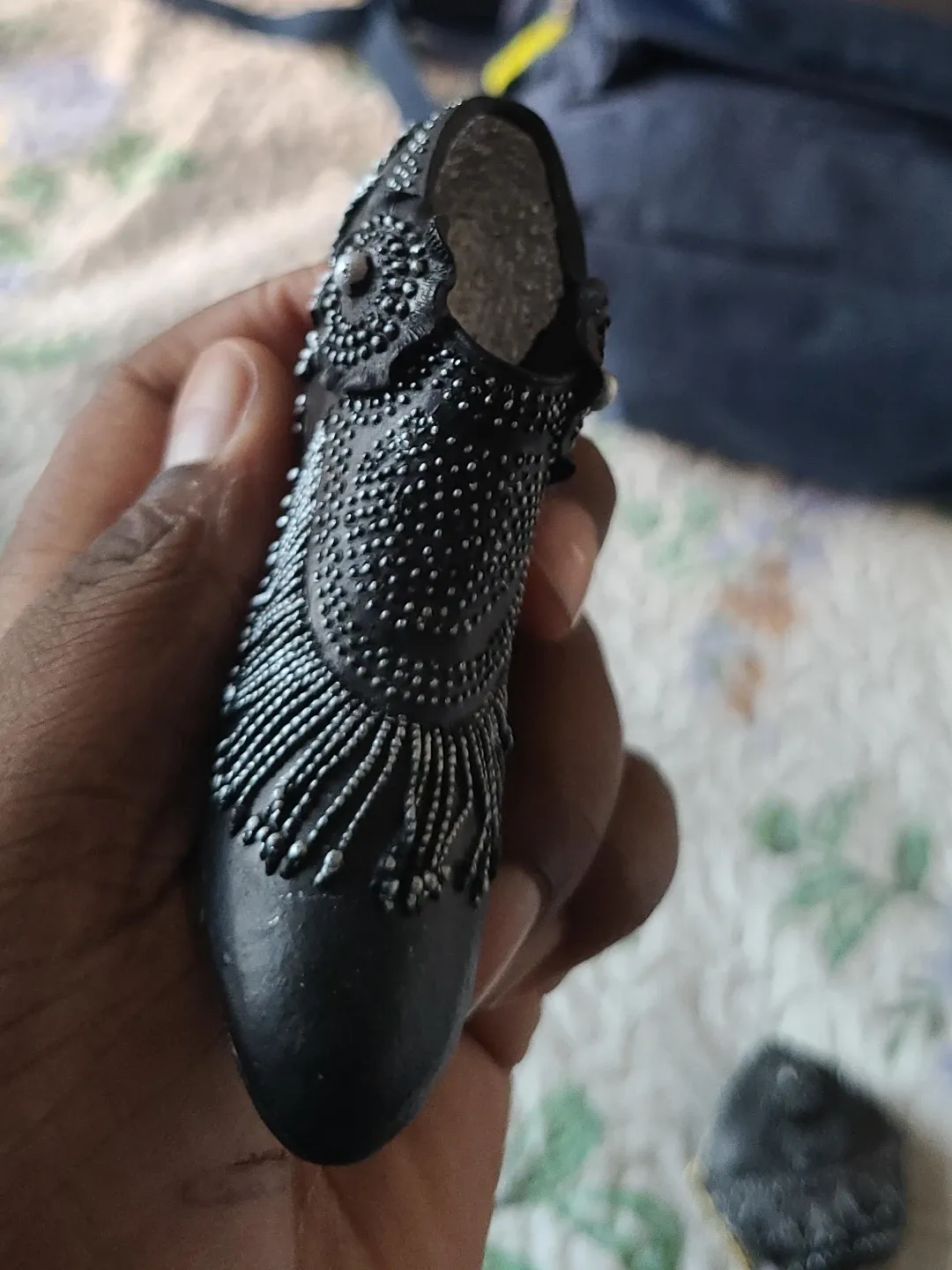 Selling a unique black decorative shoe figurine. It features intricate detailing with silver accents. A great addition to any collection or as a standalone piece!