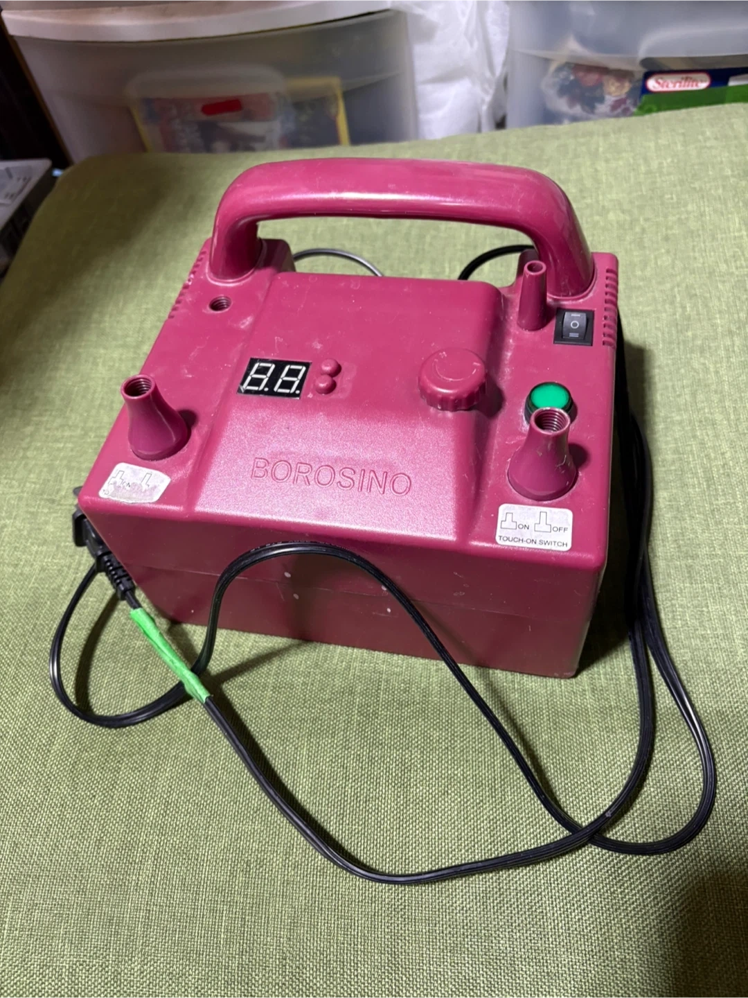 BOROSINO electric balloon inflator pump! It's in great shape and perfect for parties or events where you need to inflate a lot of balloons quickly. It features a digital display and a touch-on switch for easy operation. A handy tool for any celebration!