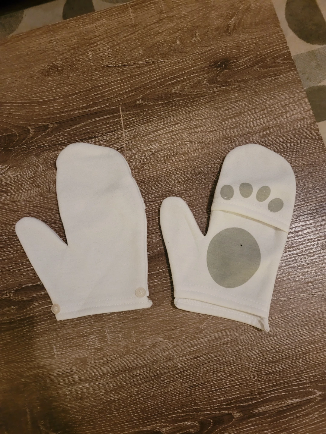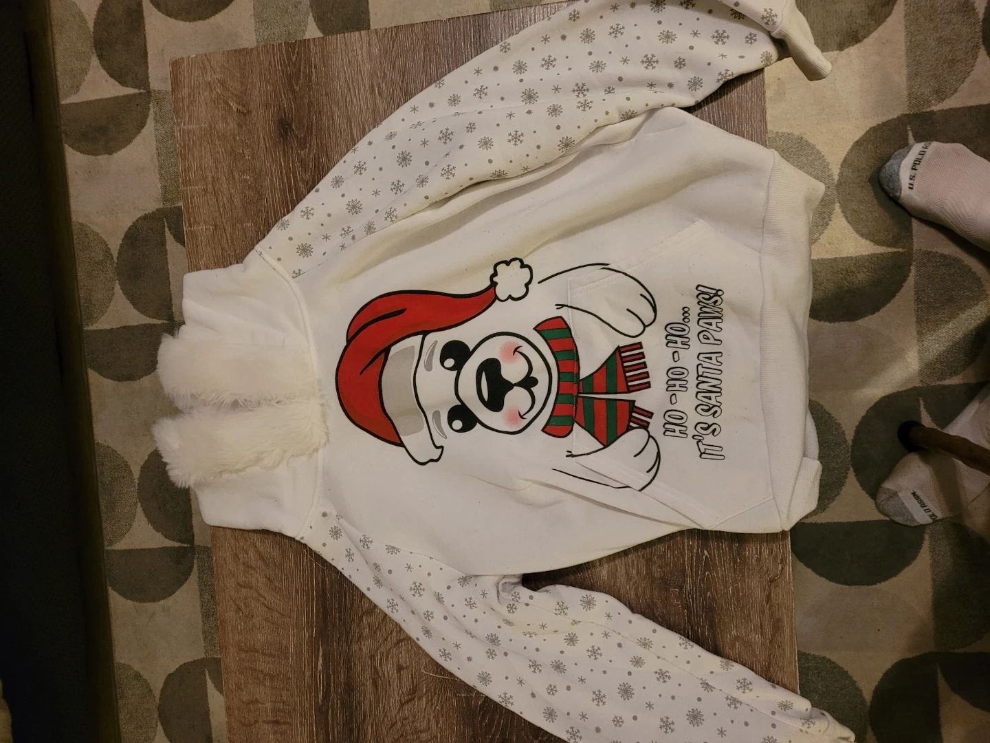 A cute white Christmas hoodie with a polar bear wearing a Santa hat and scarf on the front! It says "HO-HO-HO... IT'S SANTA PAWS!" The sleeves and hood are decorated with snowflakes. The hood has a faux fur trim. Also included are matching mittens with a paw print design. Size L/G.