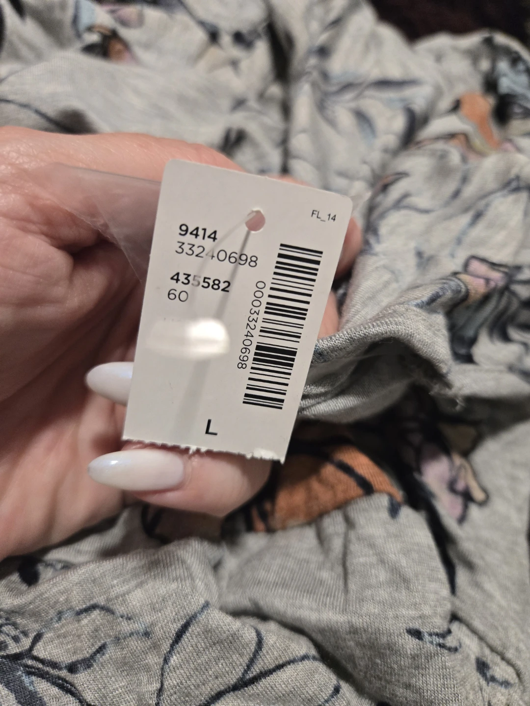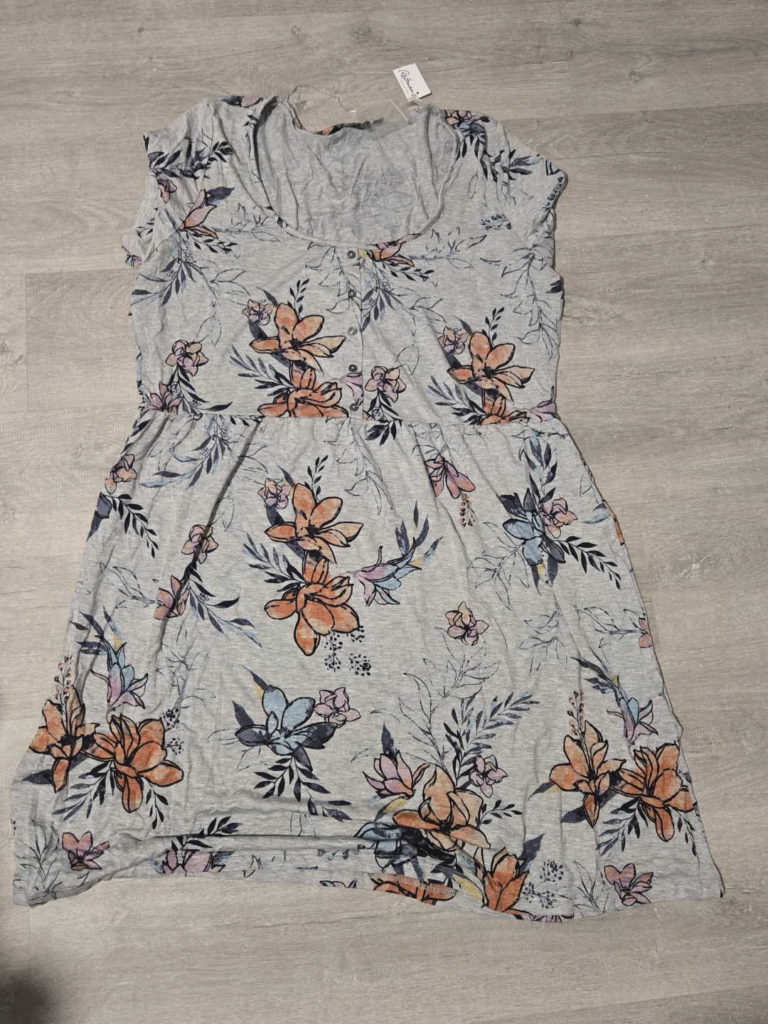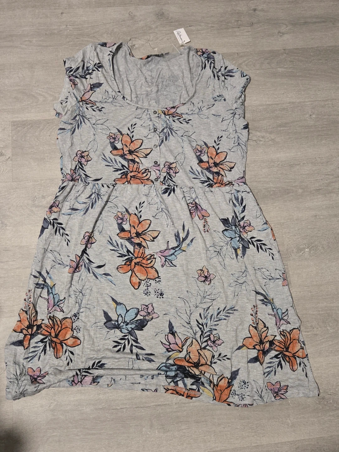 A lovely floral dress in size Large. The dress features a beautiful floral pattern in shades of blue, orange, and grey.