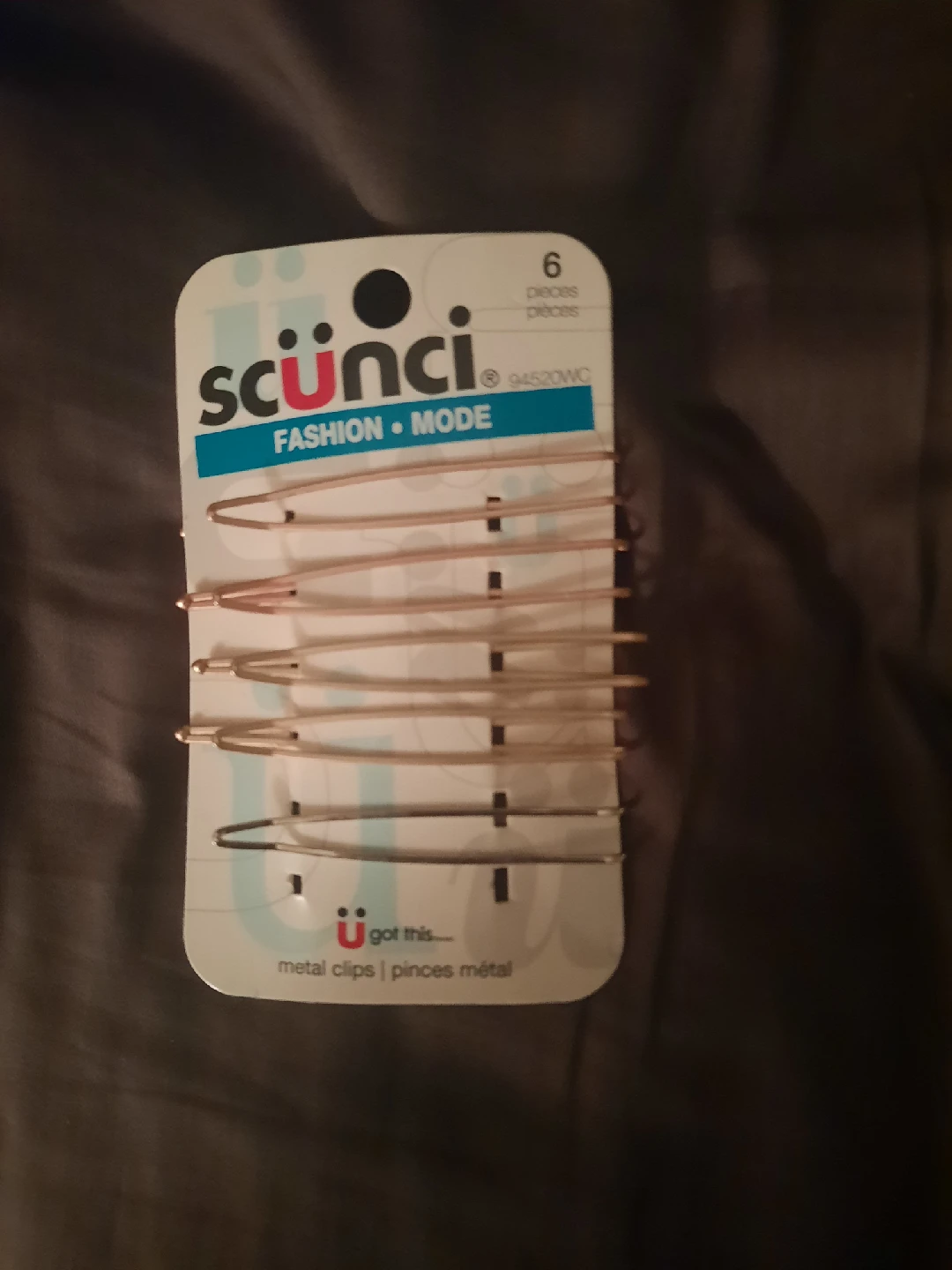 The image shows a package of Scünci brand metal clips, also known as bobby pins or slide pins, used for styling and securing hair.