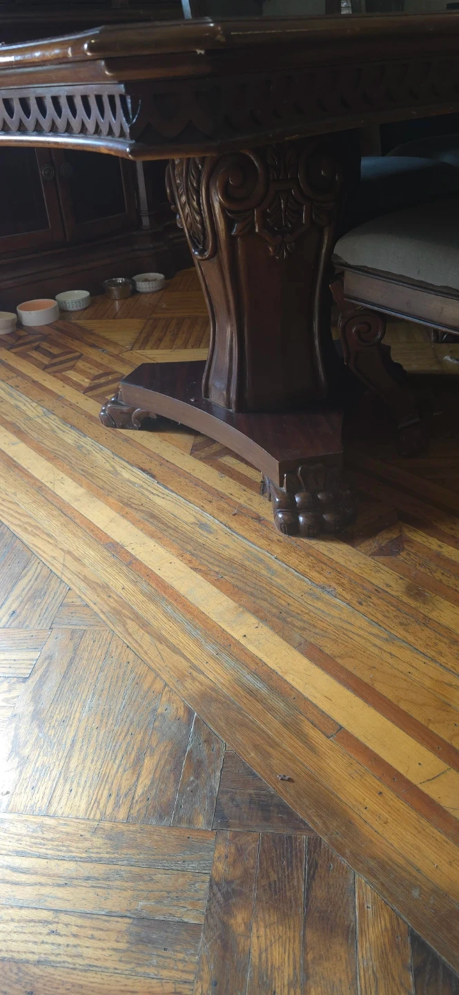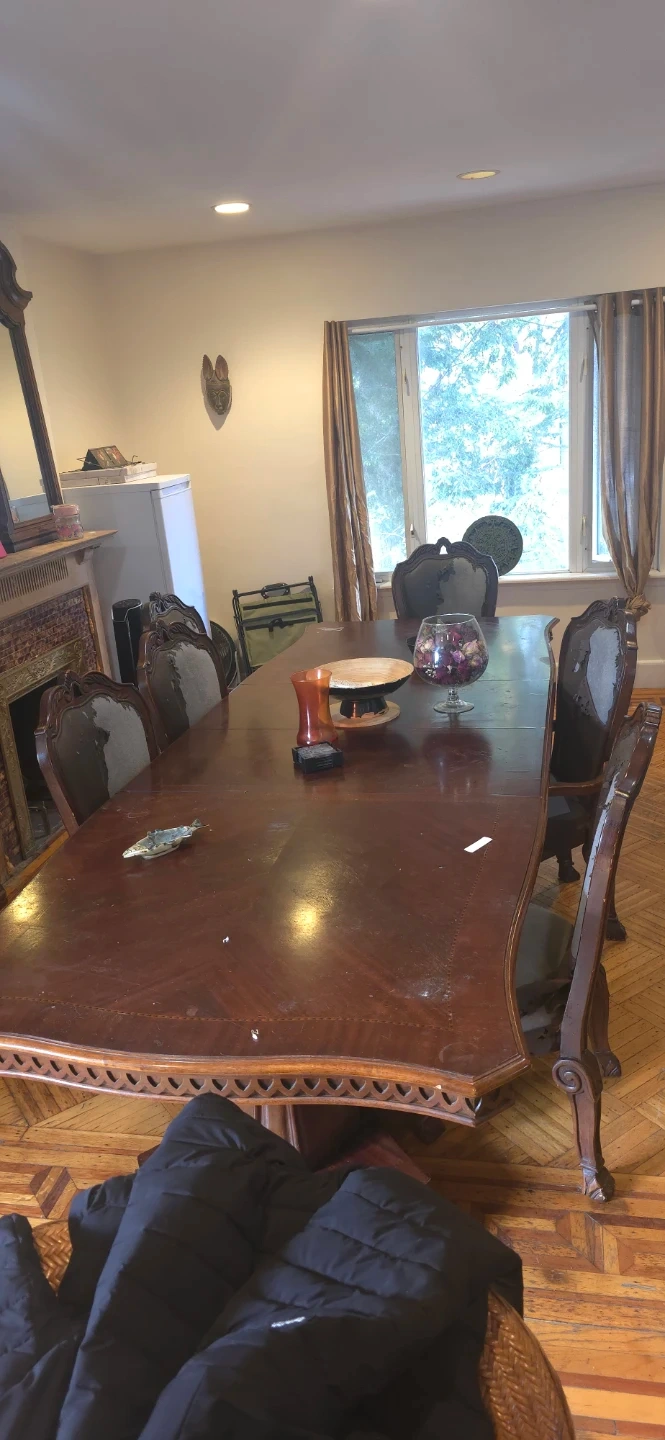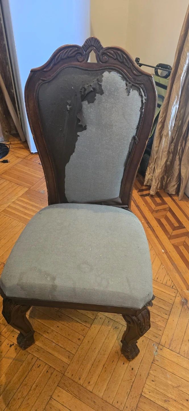 Selling an antique dining table with 6 chairs. The table is a dark wood with intricate carvings on the base. The chairs have a similar style, but the upholstery is quite worn, as you can see in the pictures. It would look great with some reupholstering!