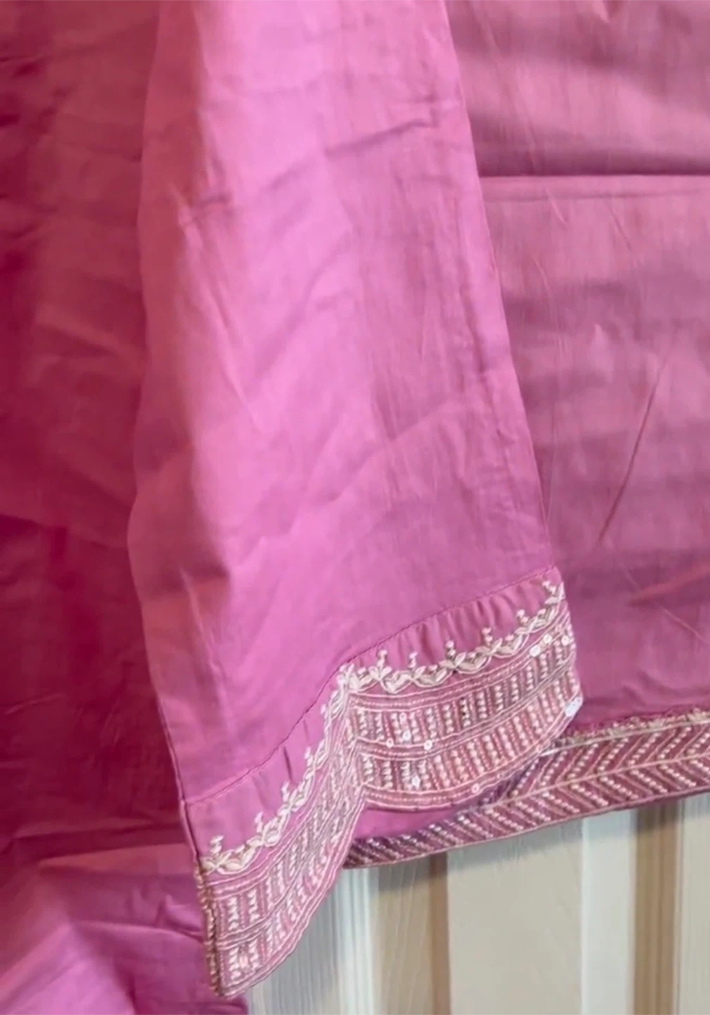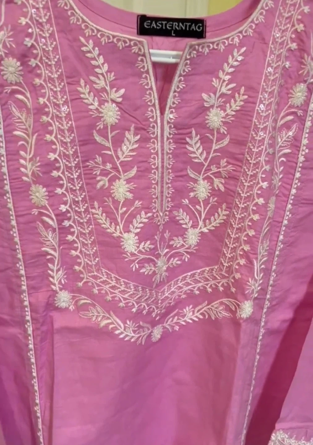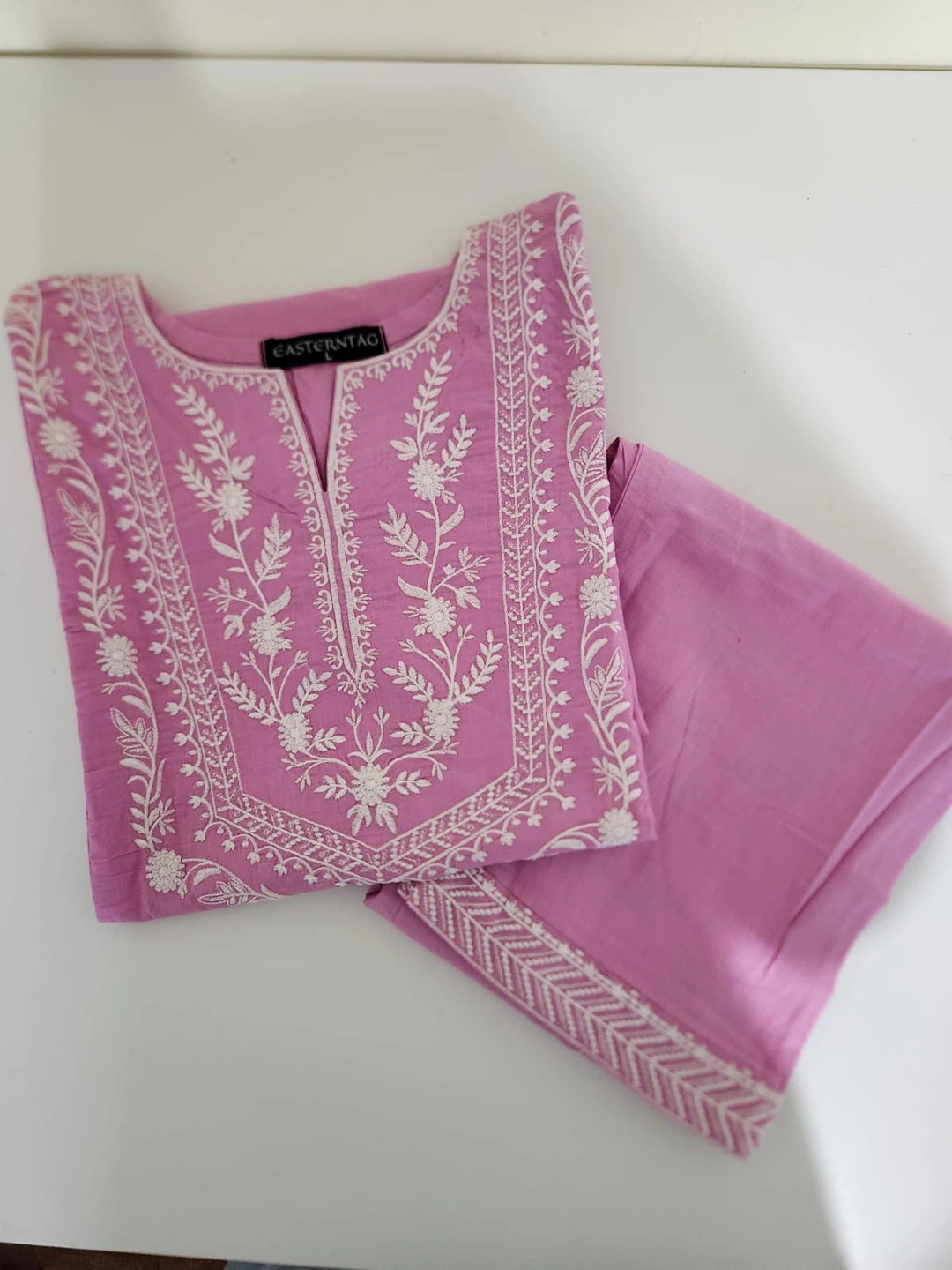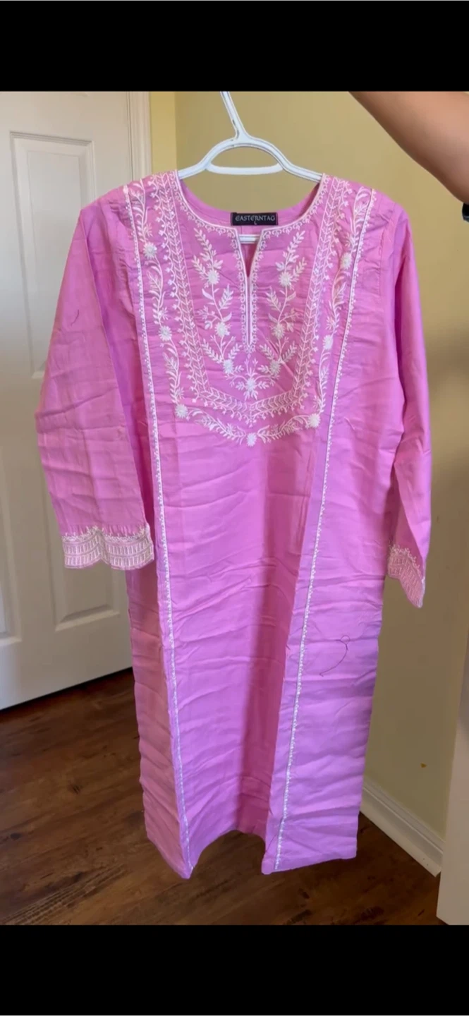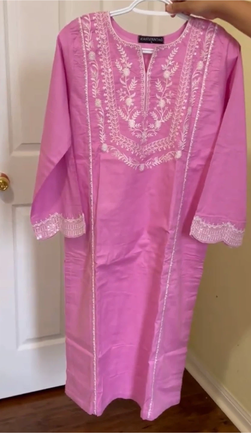 Selling a lovely pink Embroidered shirt and trousers from Eastern Tag! It features beautiful white embroidery detailing on the front and sleeves. Perfect for adding a touch of elegance to your wardrobe.