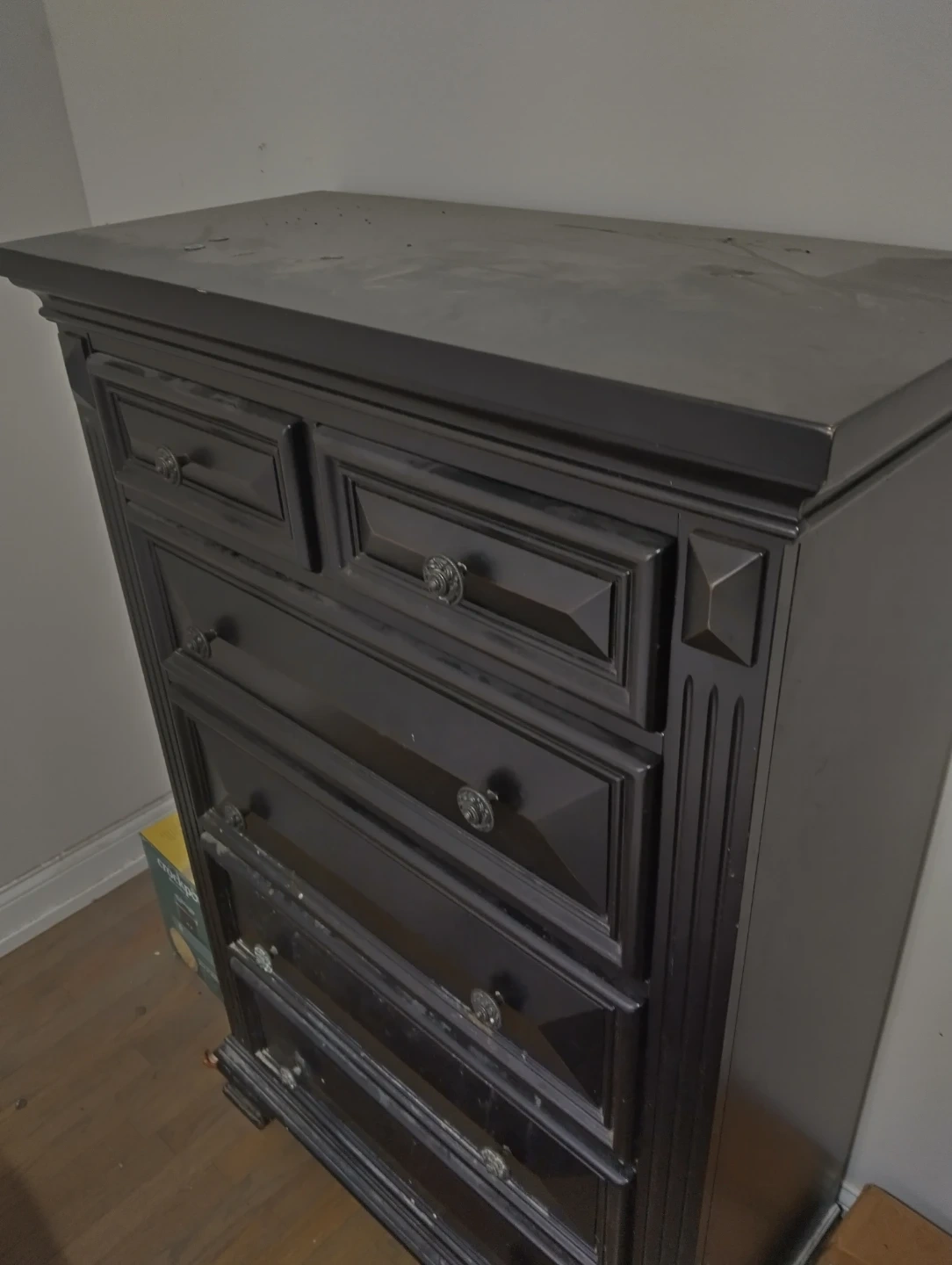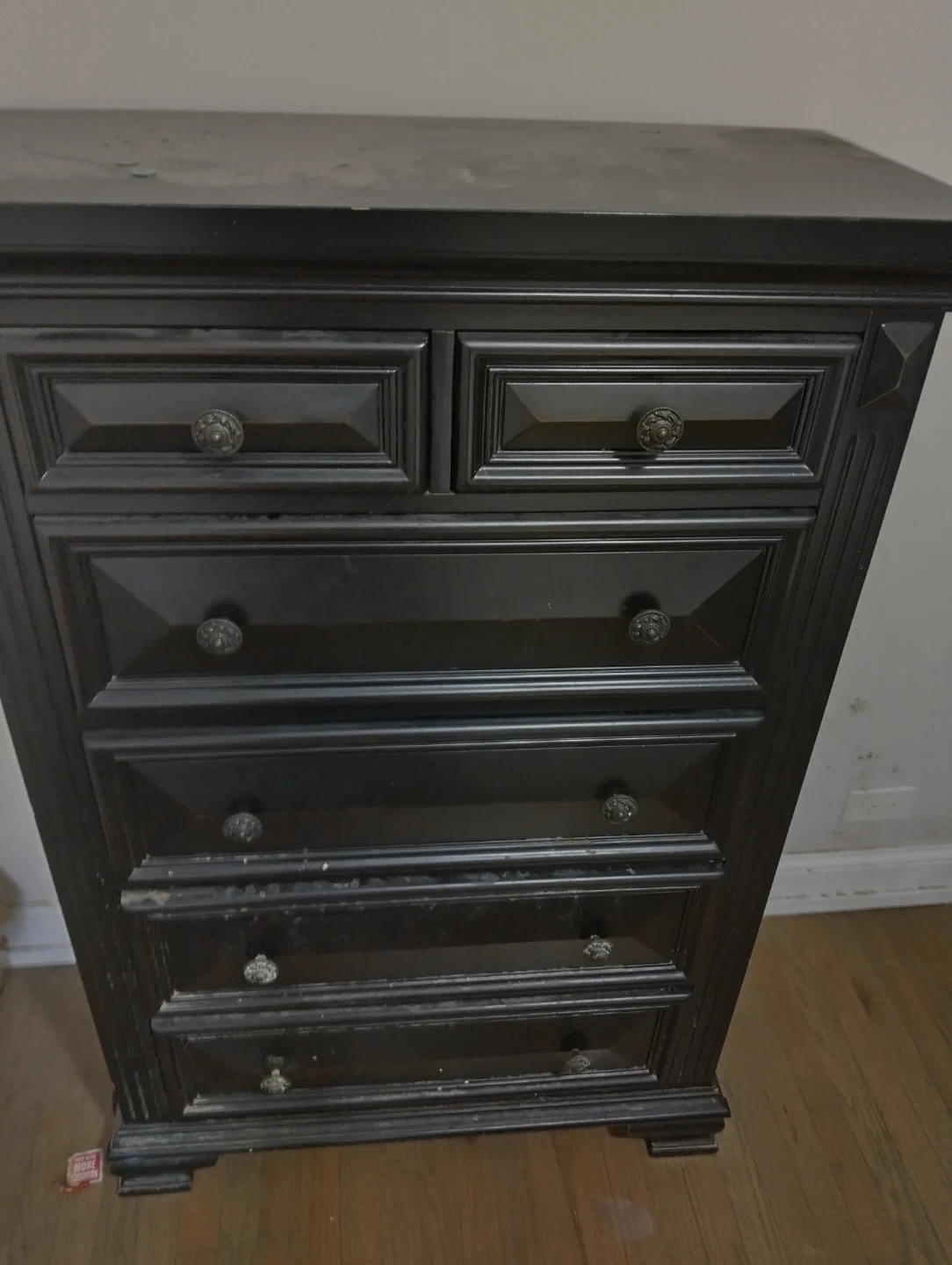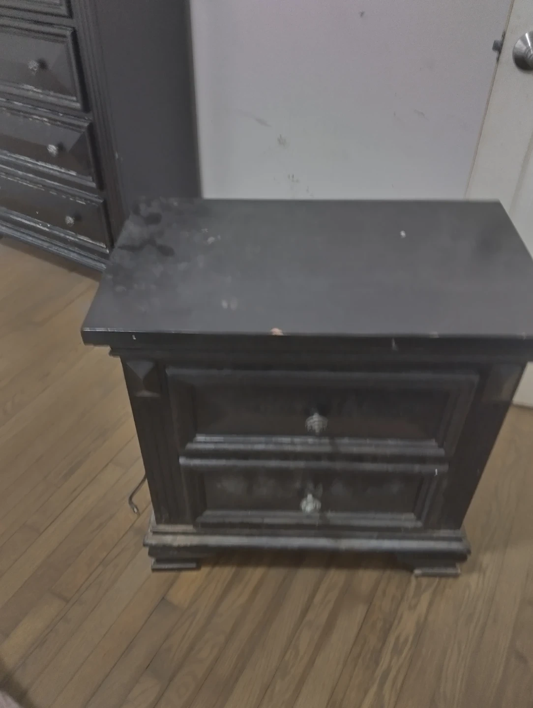 Selling a black nightstand with two drawers. It's in used condition, with some signs of wear. Perfect for adding some storage next to your bed!