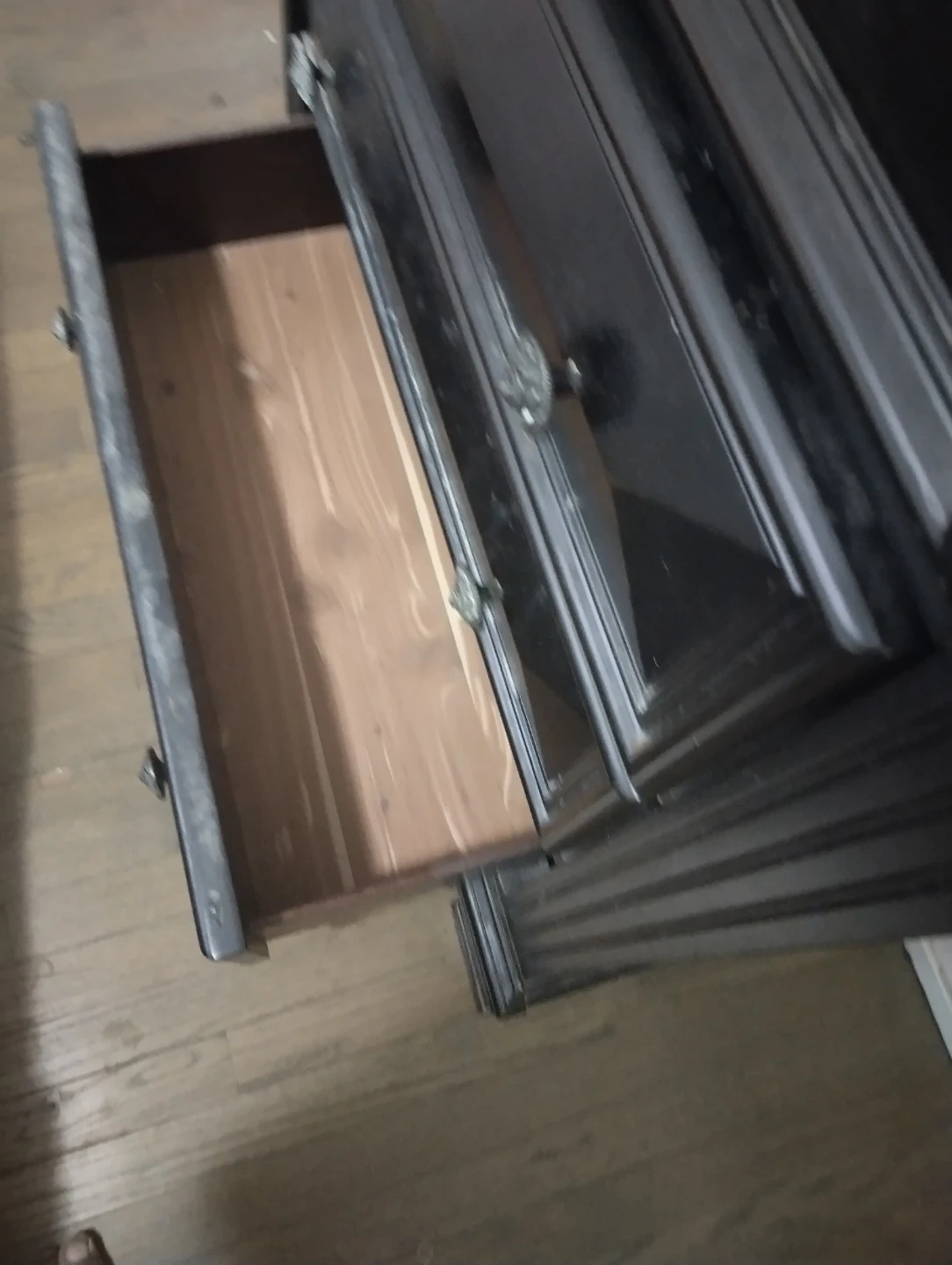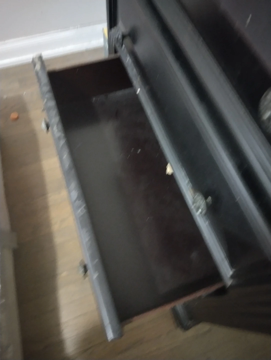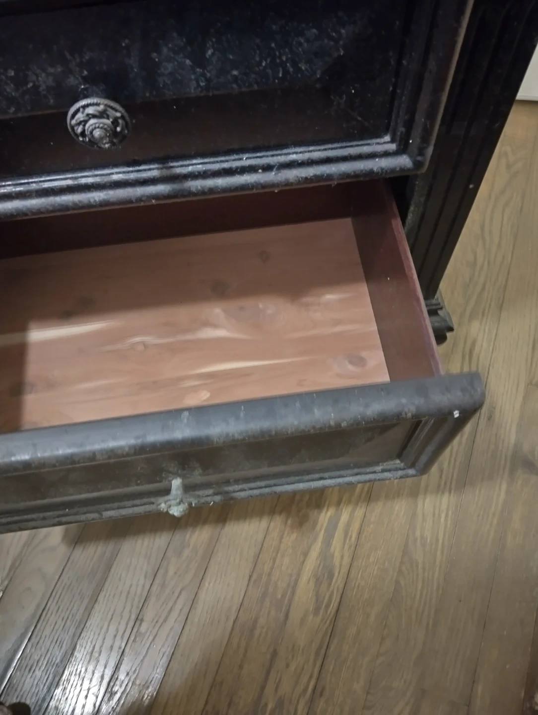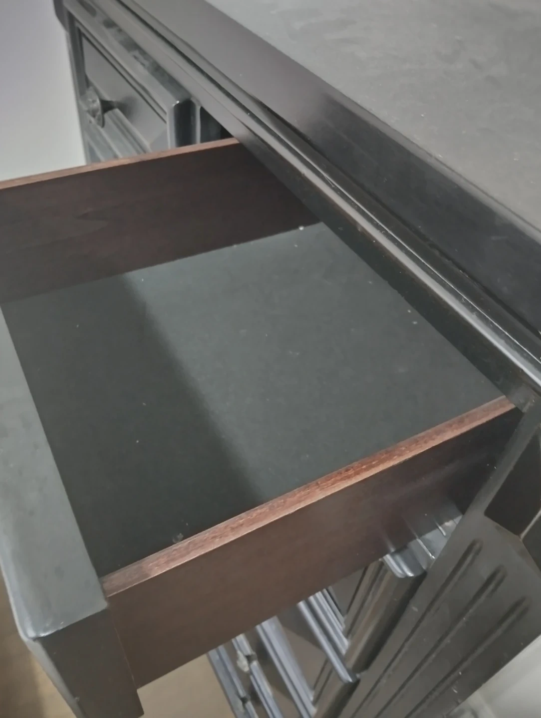 Selling a black nightstand with two drawers. It's in used condition, with some signs of wear. Perfect for adding some storage next to your bed!