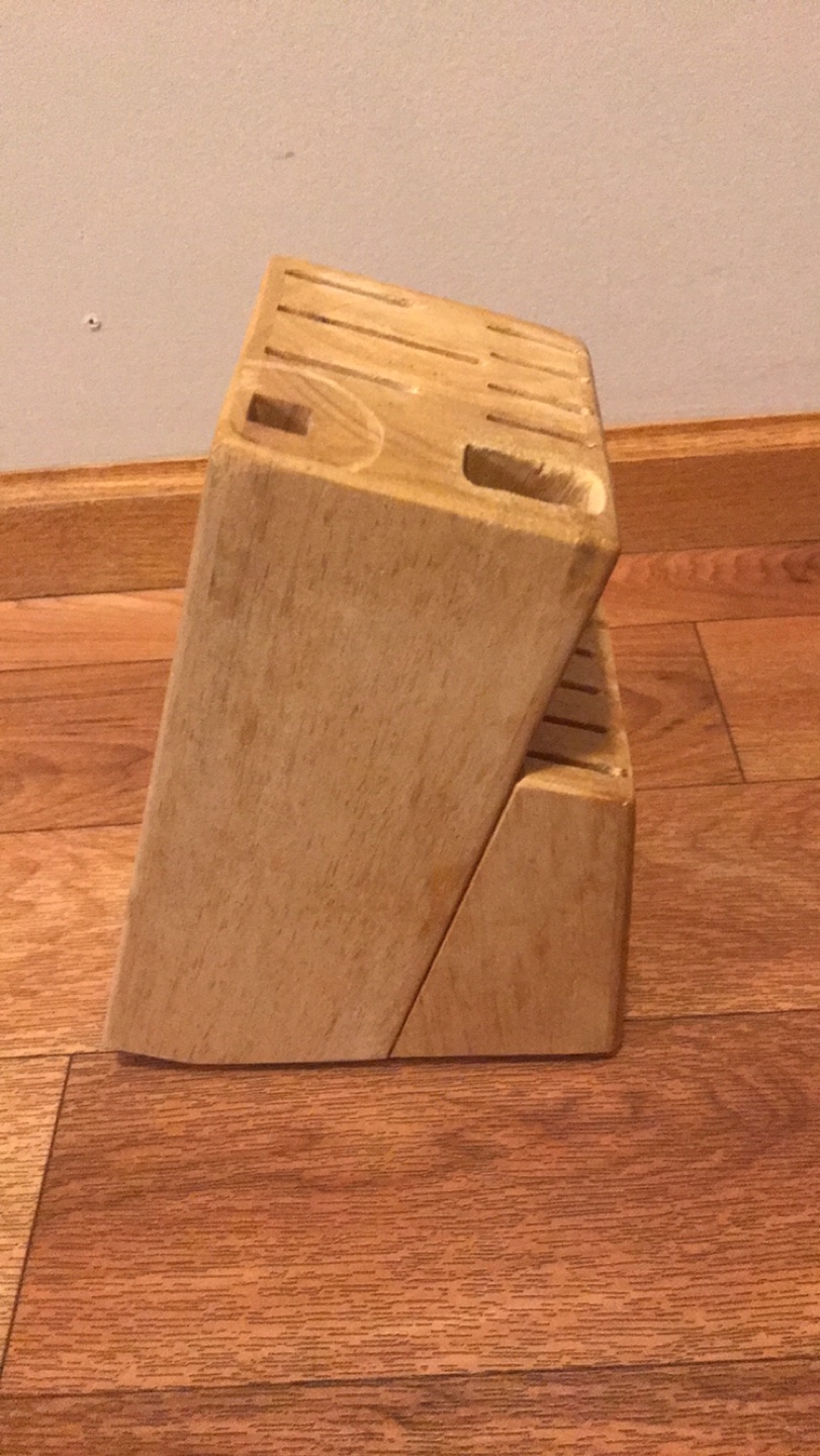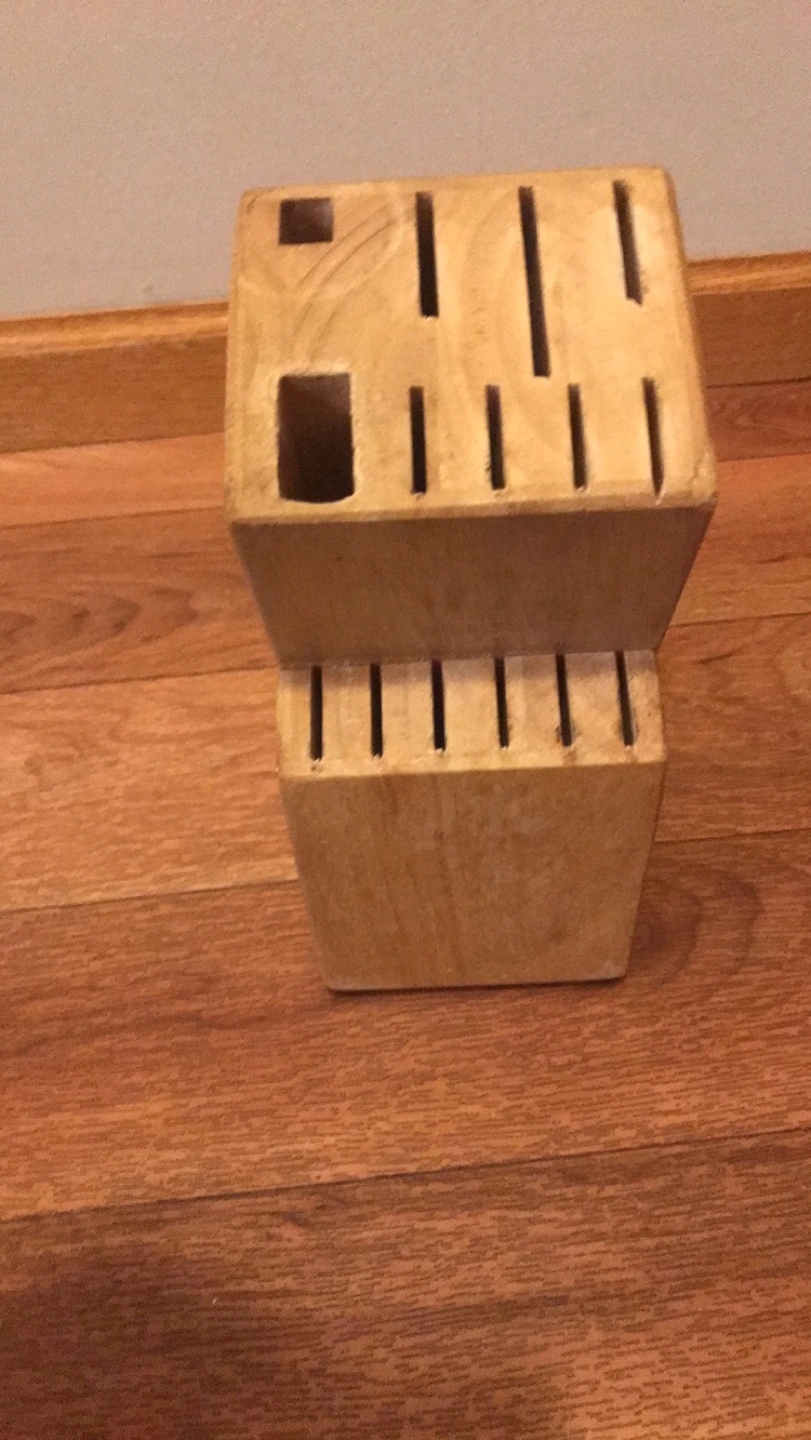 Selling a wooden knife block. It's in good condition and ready for a new home! It has various slots to accommodate different sized knives.