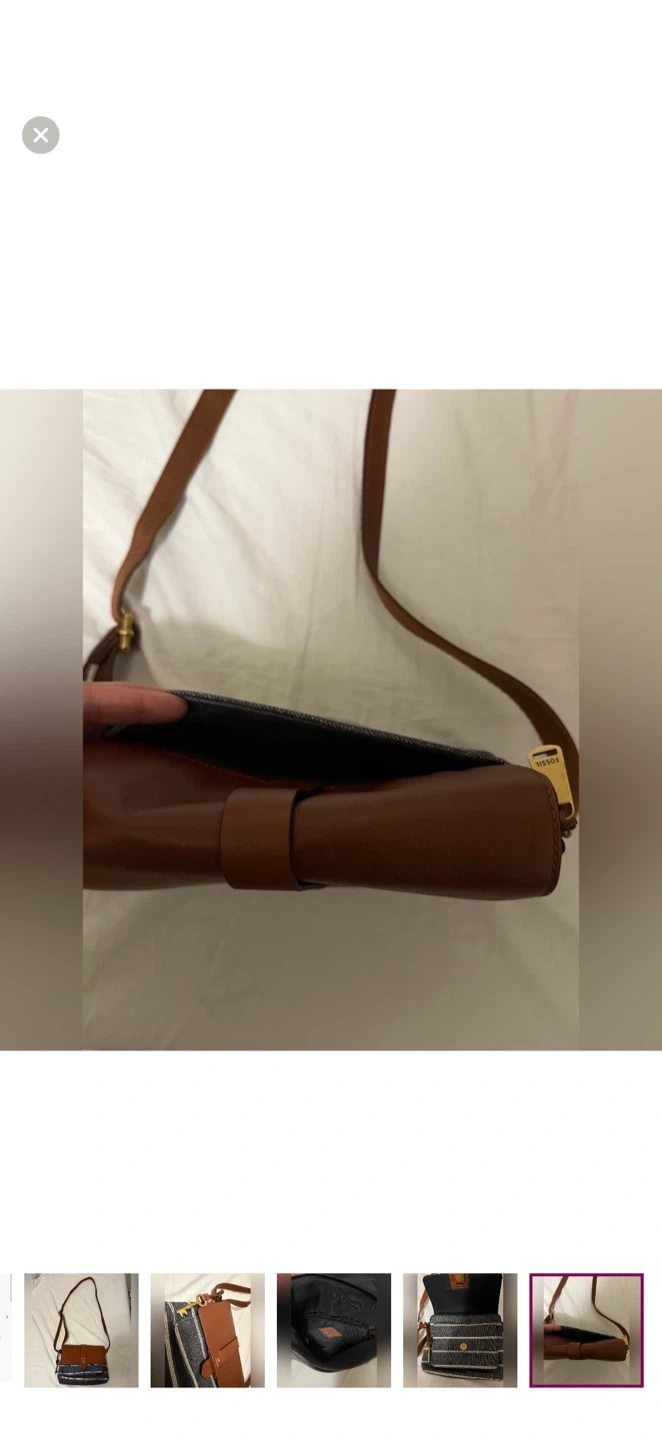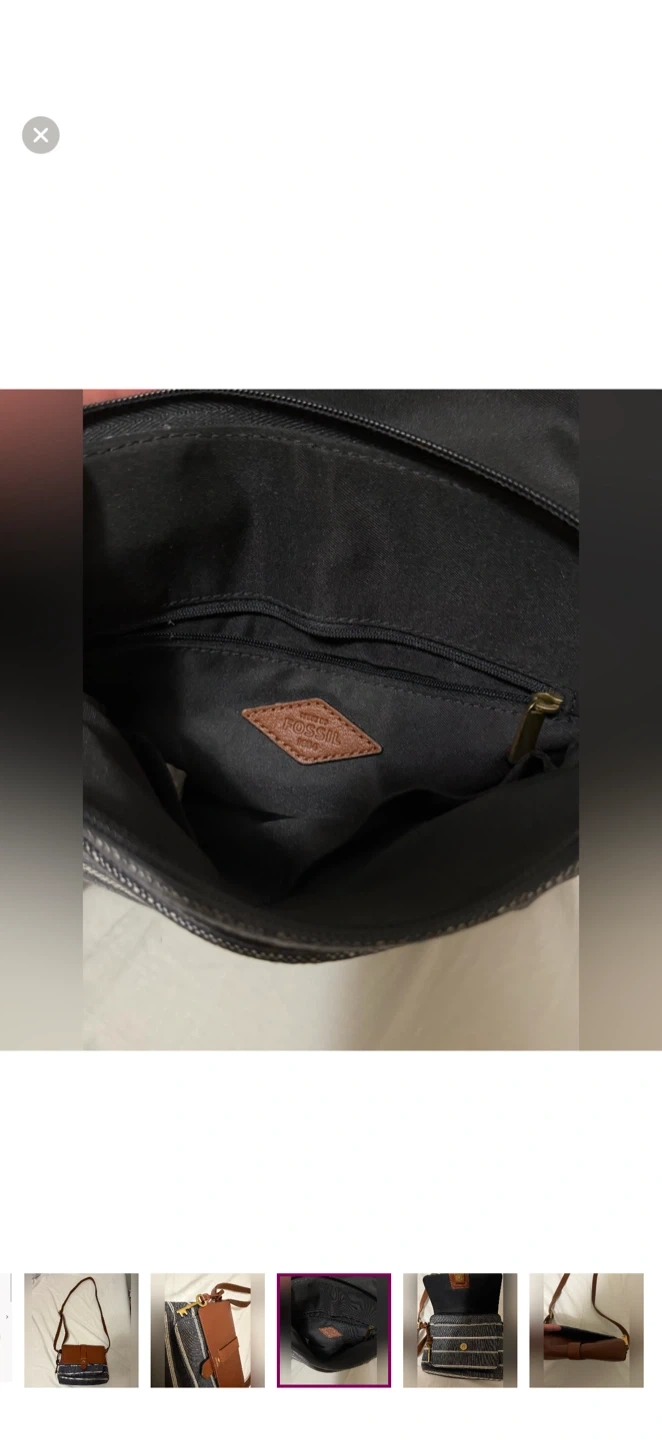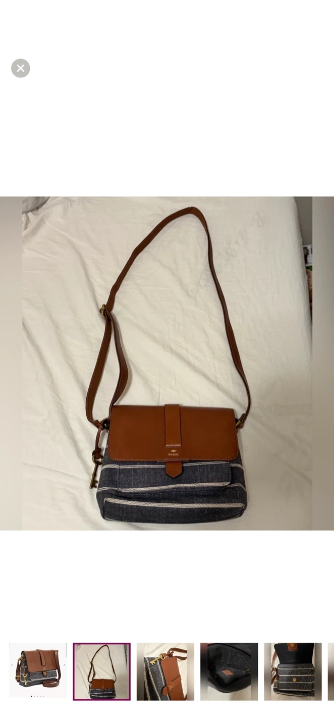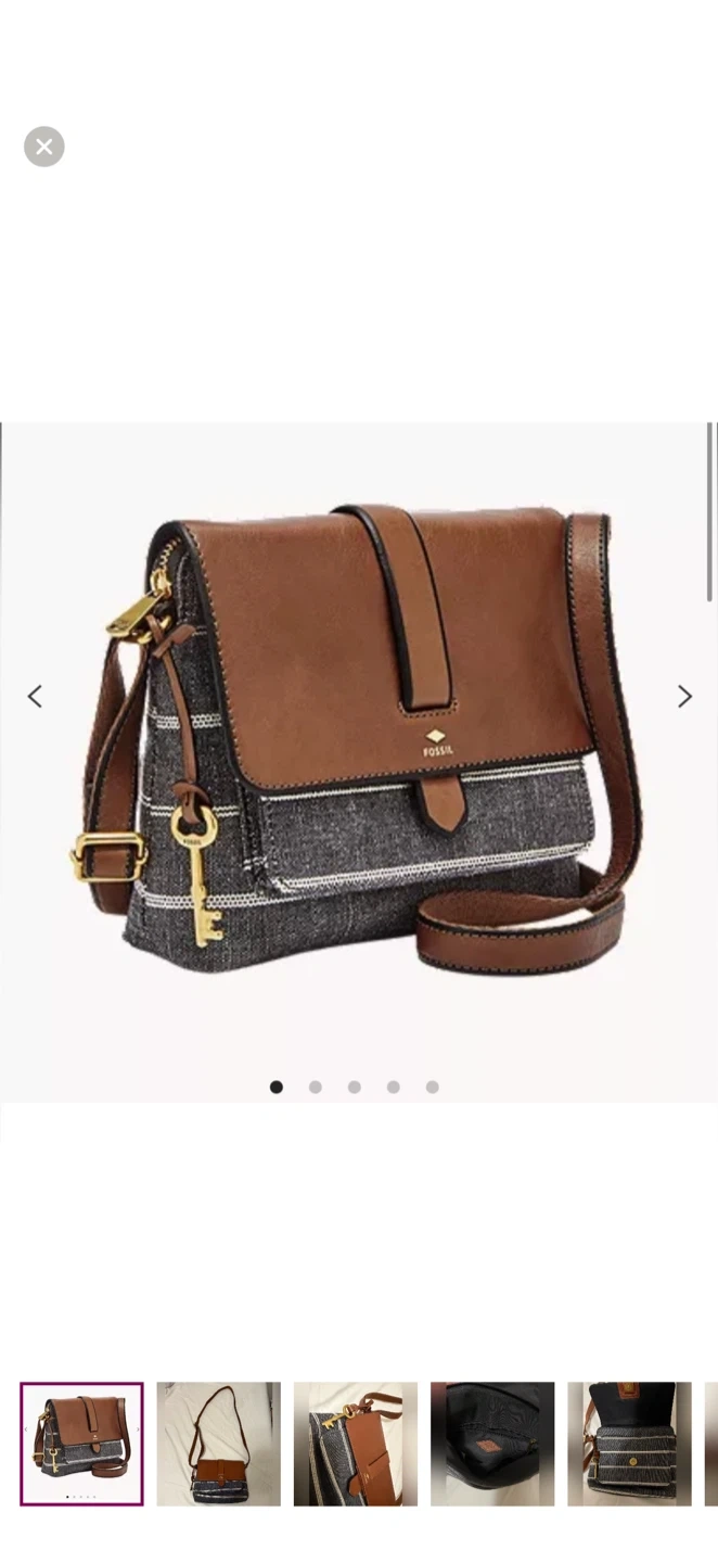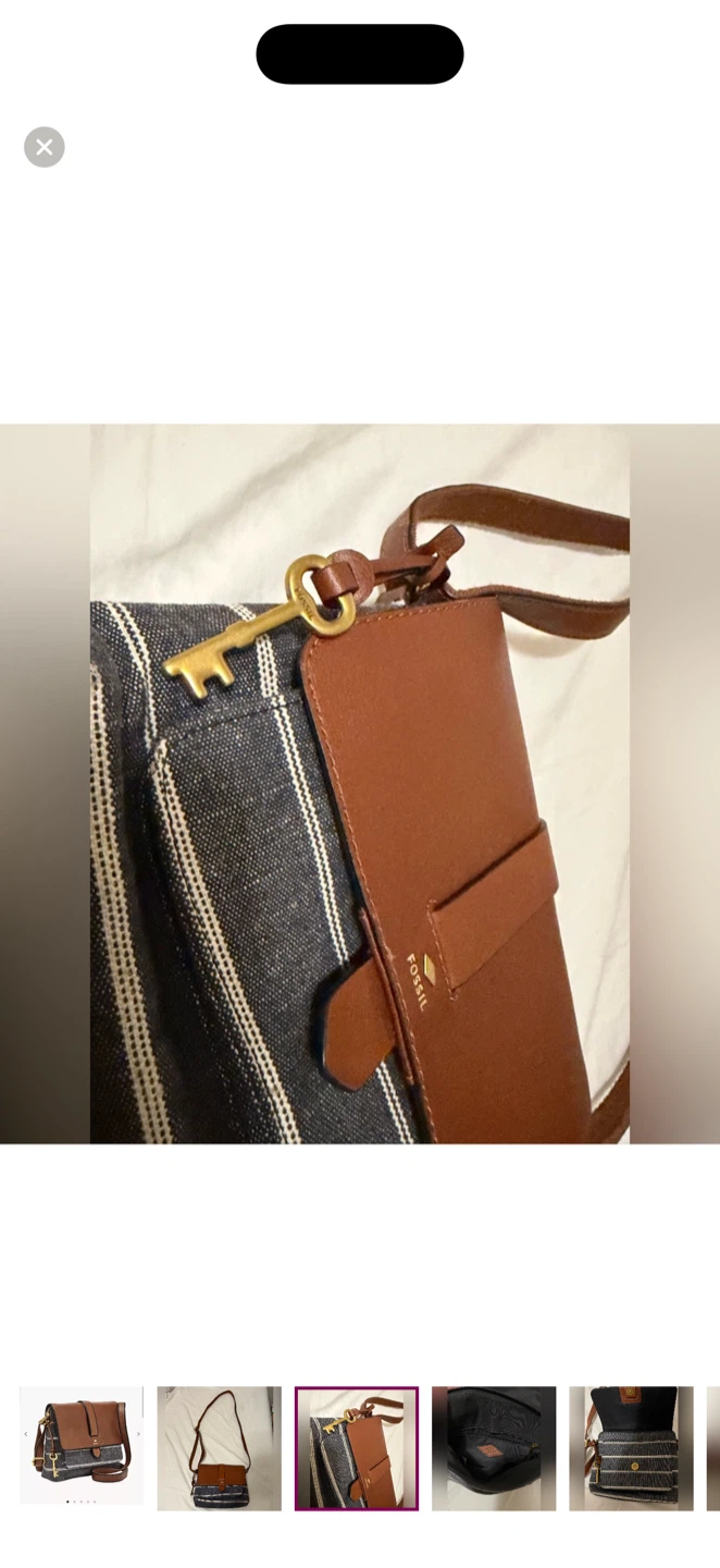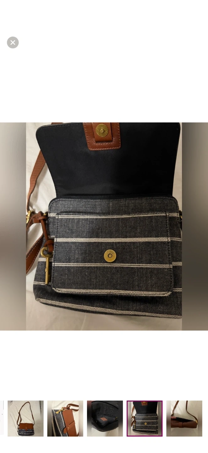 Here's a lovely Fossil crossbody bag! It features a mix of brown leather and blue striped fabric. The bag has a convenient crossbody strap and the iconic Fossil key charm.