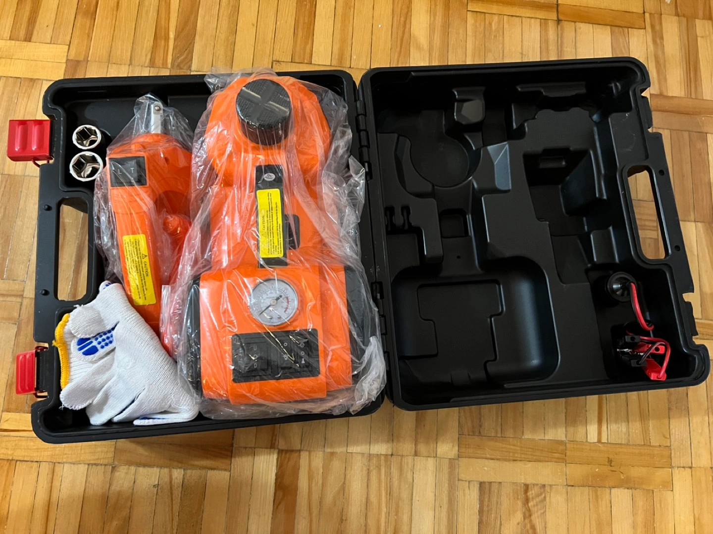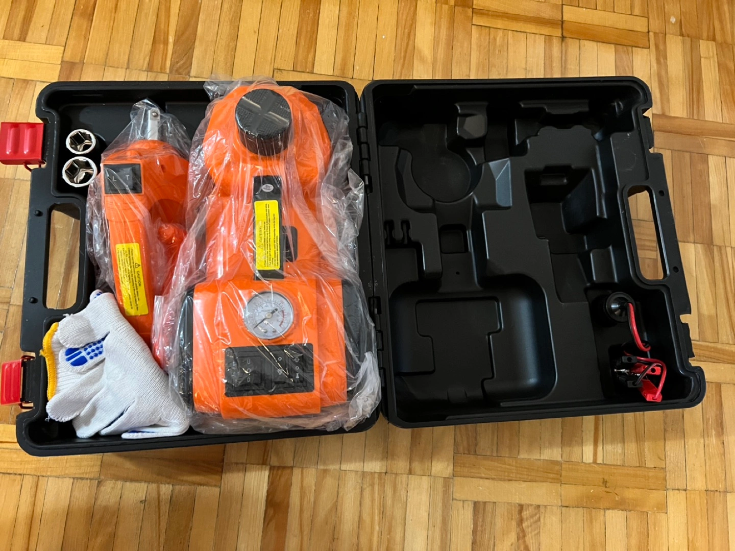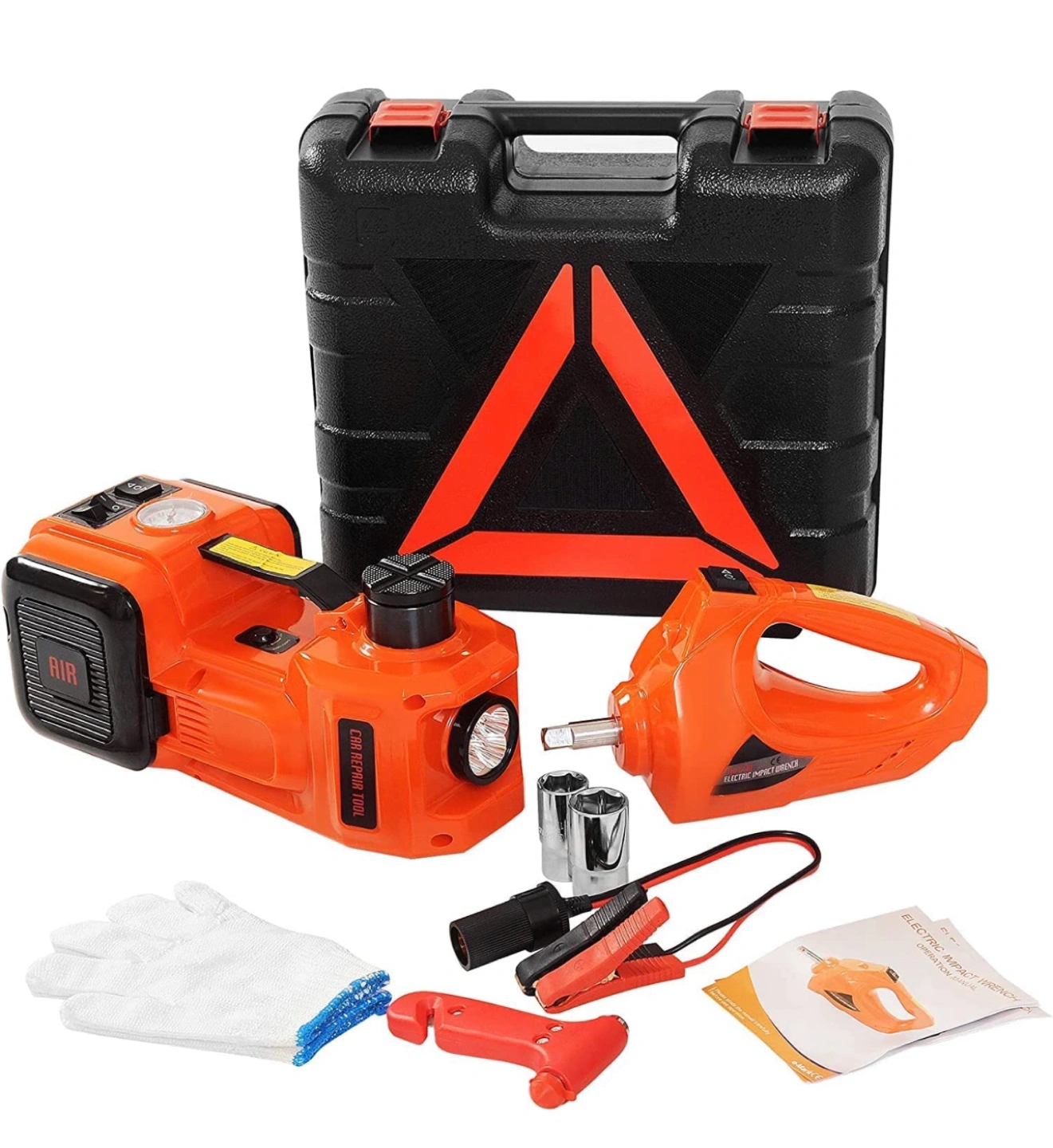 【COMPLETE ACCESSORY KIT】- Including car electric jack; safety hammer; plastic case; 3.5m power cable; Battery Clamp with Wire; Fuse ; Inflate Head ; Hex Key;Inflate Needle; Pair of Gloves; User Manual. Very portable and easy to use.