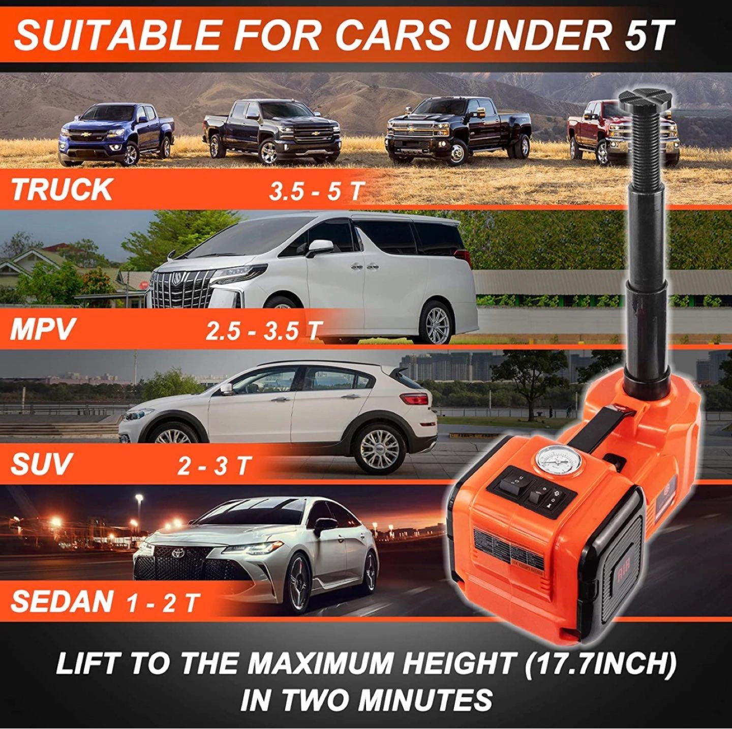 【JACK CAPACITY-5.0T/11023LB】- Working Capacity can reach up to 5.0T(11023lb)as a jack. With 12V vehicle power outlet, low pressure rod, set for the sports car. Equipped with double motor driver inside, it works independently and effectively.